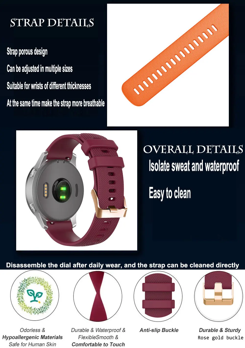 Strap materialThe strap is made of durable and elastic silicone, with a smooth and soft surface