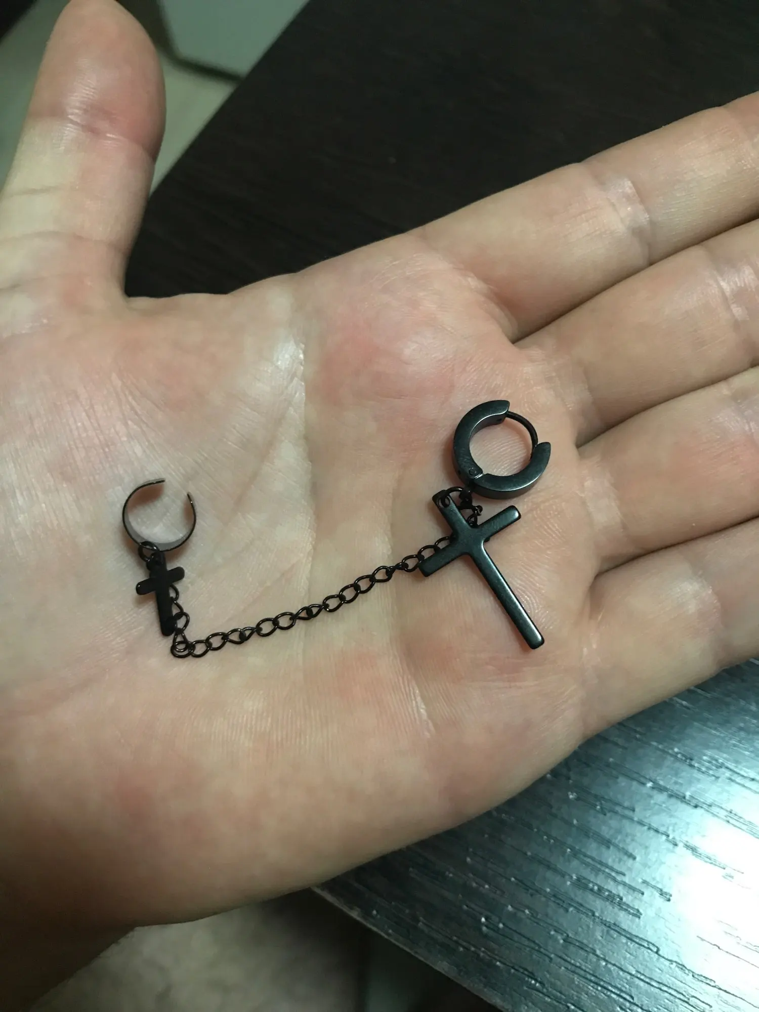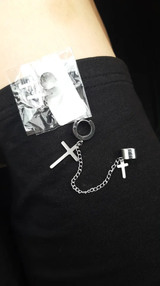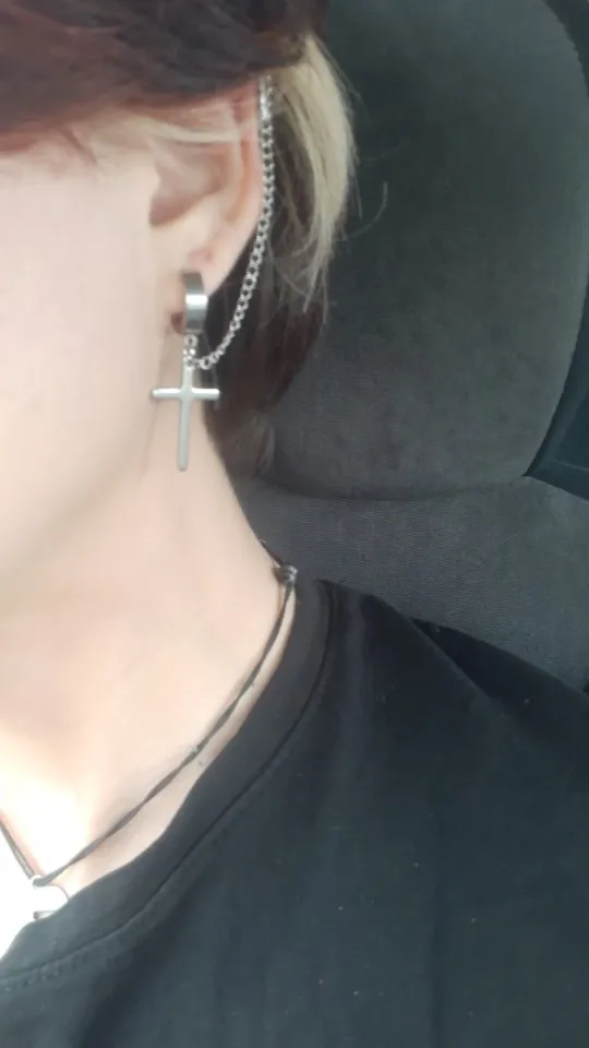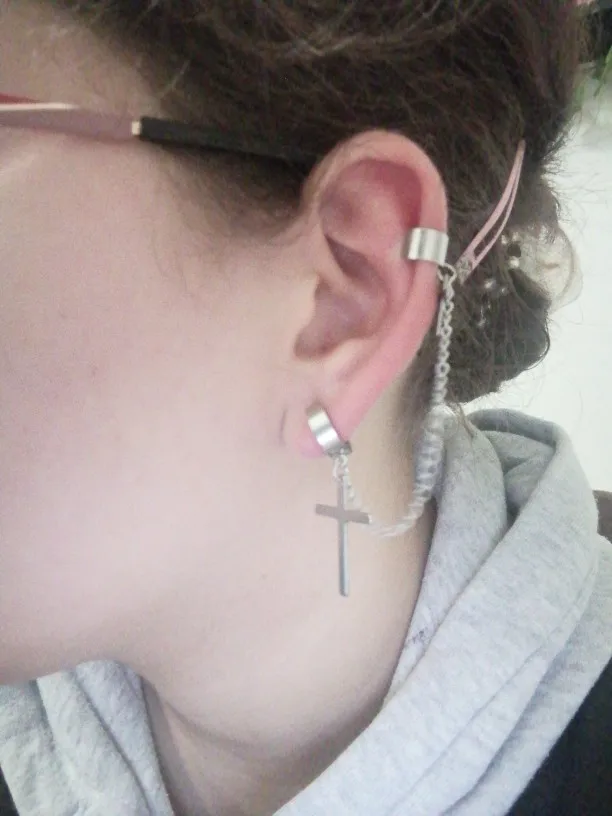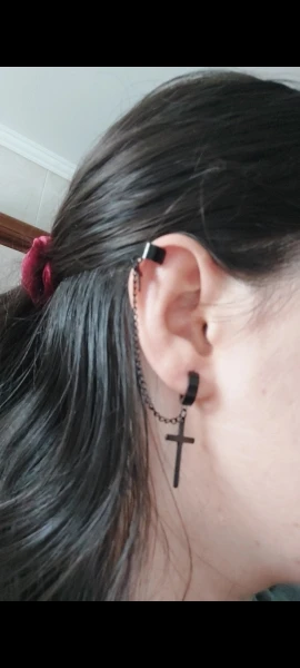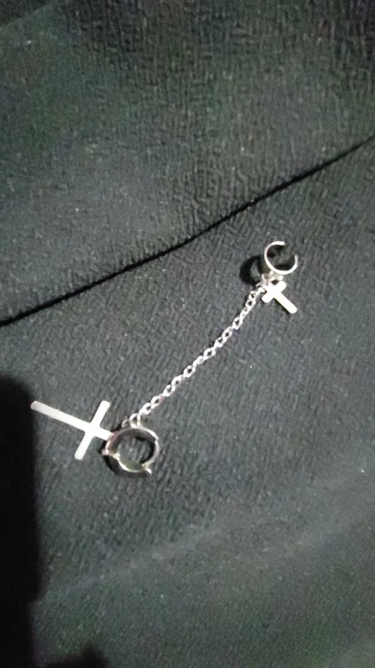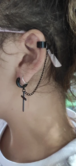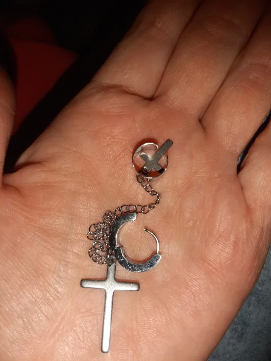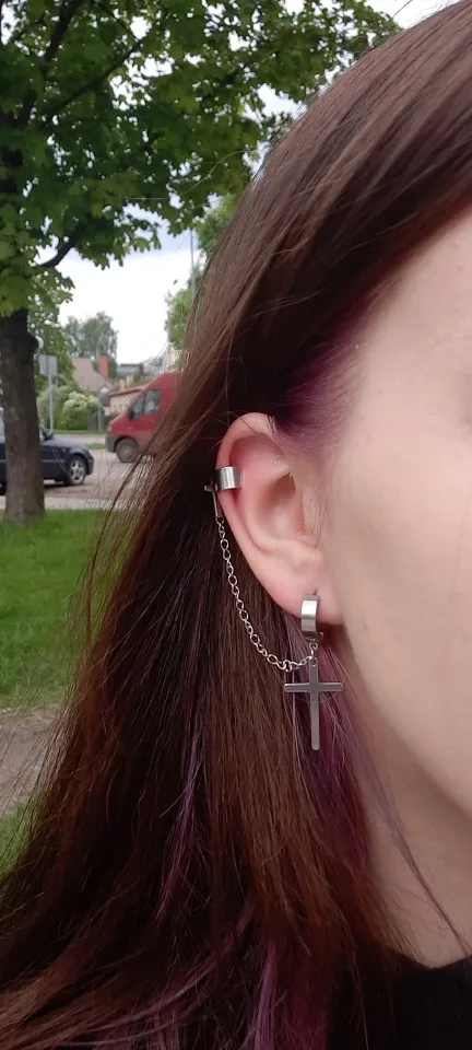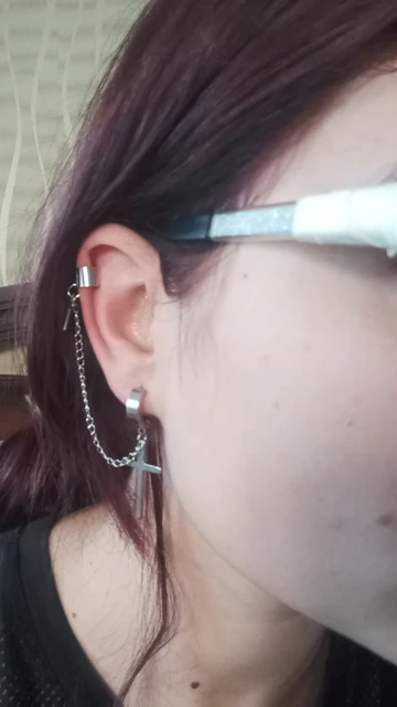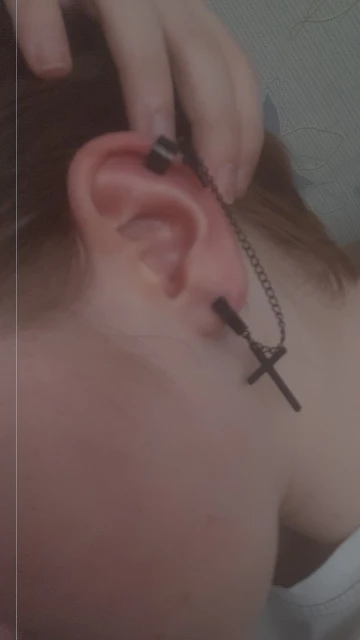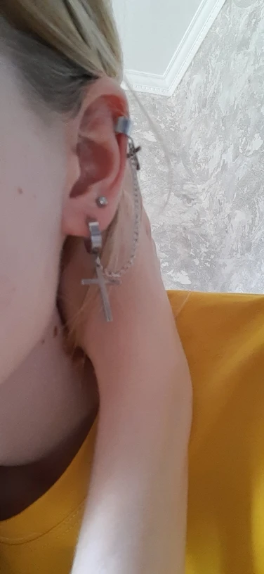 На крестах есть небольшие дефекты, но думаю, в этом нет ничего страшного, так как если не приглядываться, то этого и не заметно. Я думала серьга будет тяжелее, но оказалось что нет, она достаточно лёгкая и дискомфорта от колечка на хряще я не почувствовала