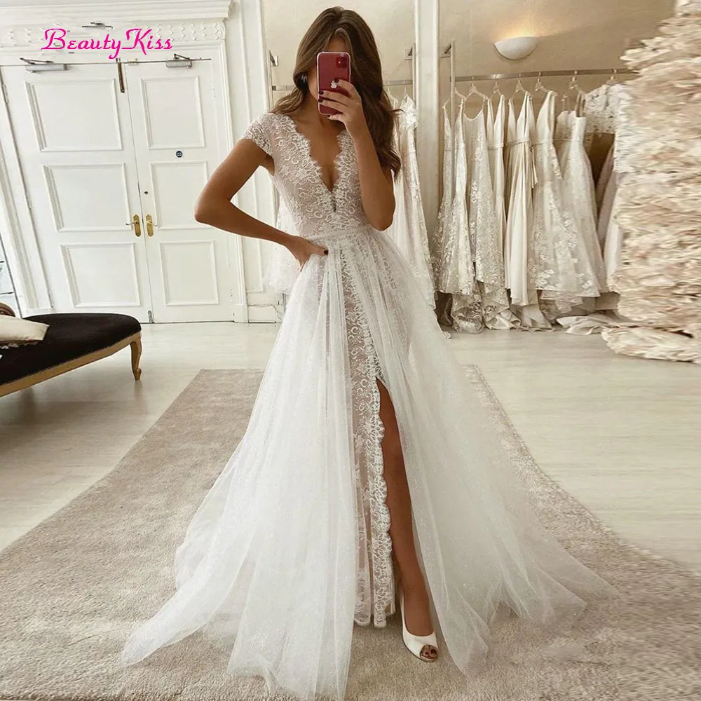 Кружевные свадебные платья с юбкой-годе со съемным цветочным рисунком, платье невесты с V-образным вырезом и рукавом-фонариком, сексуальные свадебные платья из двух предметов с Боковым Разрезом