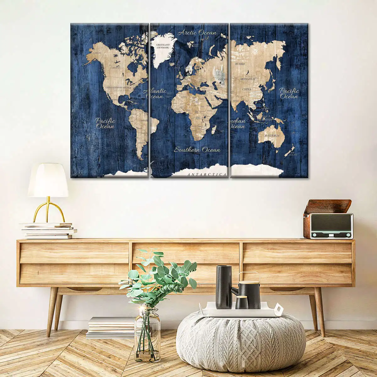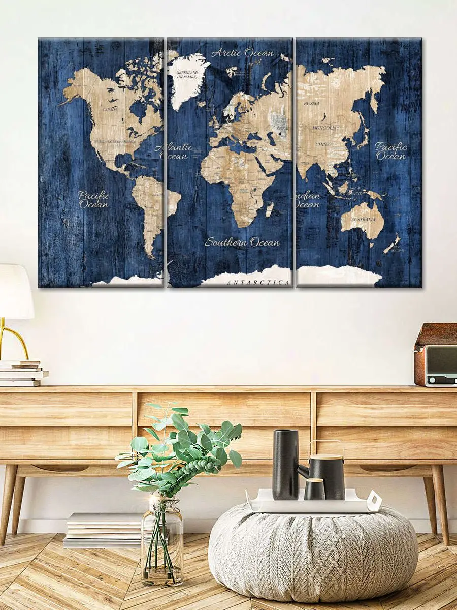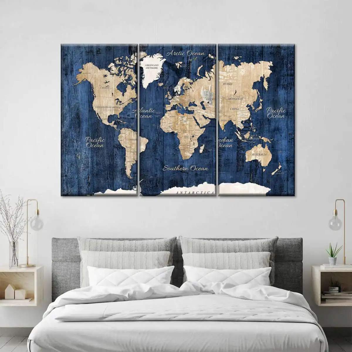Картина из 3 предметов, карта мира на деревянной стене, Постер для декора комнаты, холст, Настенная картина, подарок, домашний декор