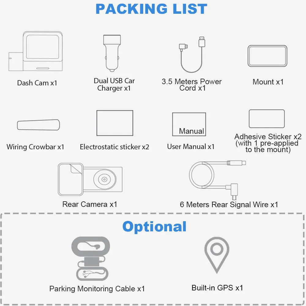 ● 1 упаковочная коробка● Видеорегистратор-1 шт.● Автомобильное зарядное устройство с двумя usb-портами-1 шт.● Кронштейн-1 шт.• 1 х 3,5 метров Мощность шнур● 1 х электропроводка● 2 x Электростатическая наклейка● 2 клейких наклейки (с 1 предварительно нанесенным на кронштейн)● Руководство пользователя-1 шт.• 1x1080 P зеркало Камера с 6 м кабель● Встроенный GPS модуль-1 шт.(Опционально)● 1 понижающая линия для 24H мониторинга парковки(Опционально)● Высокоскоростная TF карта класса 10-1 шт.(Опционально)