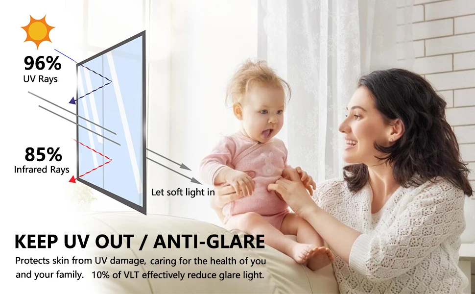 Оконная пленка от солнца WochiTV блокирует до 96% УФ-лучей и защищает кожу от повреждений. Между тем оттенок окна дома эффективно фильтрует блики, уменьшает выцветание и старение мебели и обеспечивает комфортную среду.