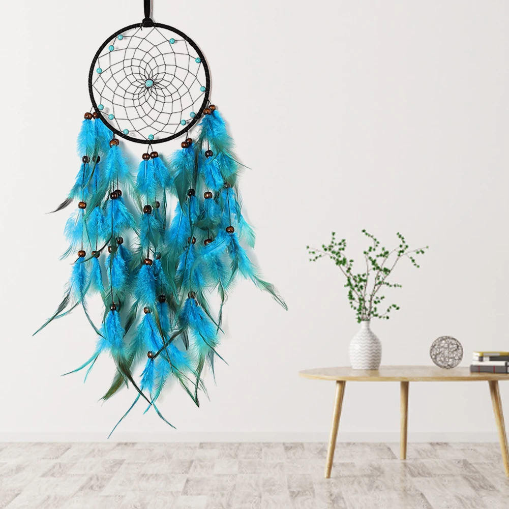 Ловец снов ручной работы, индийский Ловец снов, подвесной с бусинами из ротанга светильник-голубые перья, настенное украшение для дома, украшение для спальни