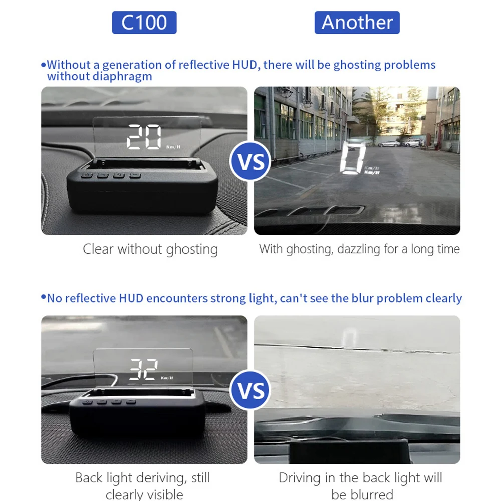 C100 OBD 2 HUD Дисплей вверх лучше, чем A100 OBD2 HUD проектор дисплейПодключи и играй подключение с любым OBDII или EUOBD способным транспортным средством;Многоцветная конструкция делает экран более насыщенным и легче читатьНано-технология для устранения двойных отражений, более четкая.Богатое содержание: скорость, об/мин, температура воды, напряжение, Сигнализация низкого напряжения, сигнализация с высокой температурой воды, сигнализация с превышением скоростиАвто Включение/выключение питания: Пуск и выключение HUD с запуском и выключением транспортного средства, Эффективная защита автомобильного аккумулятора; Сохранение ручного переключателя Режим, более простой в управлении HUD.Автоматическая и Ручная настройка для сигнализации с высокой температурой воды, Сигнализация низкого напряженияПосылка включает в себя: