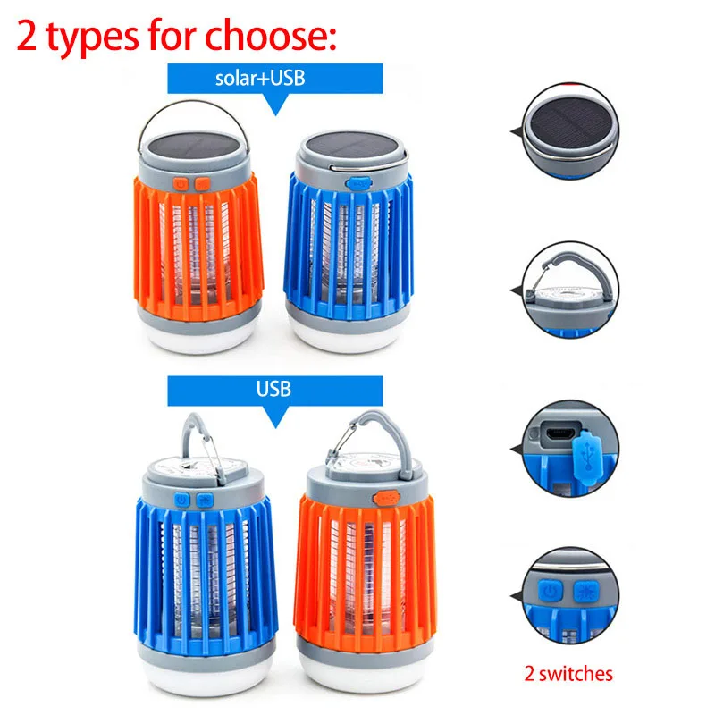 * Материал: АБС-пластик* Тип лампы:Без вилки или usb лампы или USB + солнечный светильник на выбор* Цвет корпуса: 4 цвета, оранжевый, синий, черный, белый* Длина волны УФ-светильник: 360-400нм* Дополнительный светильник режимов ing: высокий светильник/низкий светильник/SOS/cob светильник + УФ-москитный светильник zapper