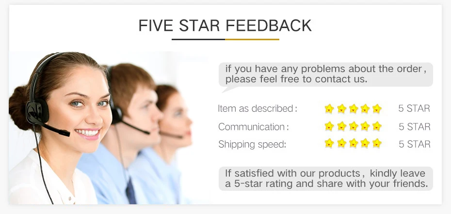 1. Ваше подтверждение будет высоко оценено после получения товаров. Как только вы получили товар, надеемся, что вы оставите нам положительный отзывы (4 или 5 звезд).2. Прежде чем оставлять негативные отзывы. Сначала свяжитесь с нами, и мы поможем вам решить проблему.3. Мы стремимся сделать все лучше, чтобы вы были довольны!