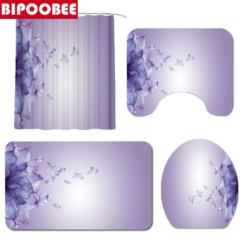 Набор из занавески для душа с фиолетовыми цветами, коврики для ванн...