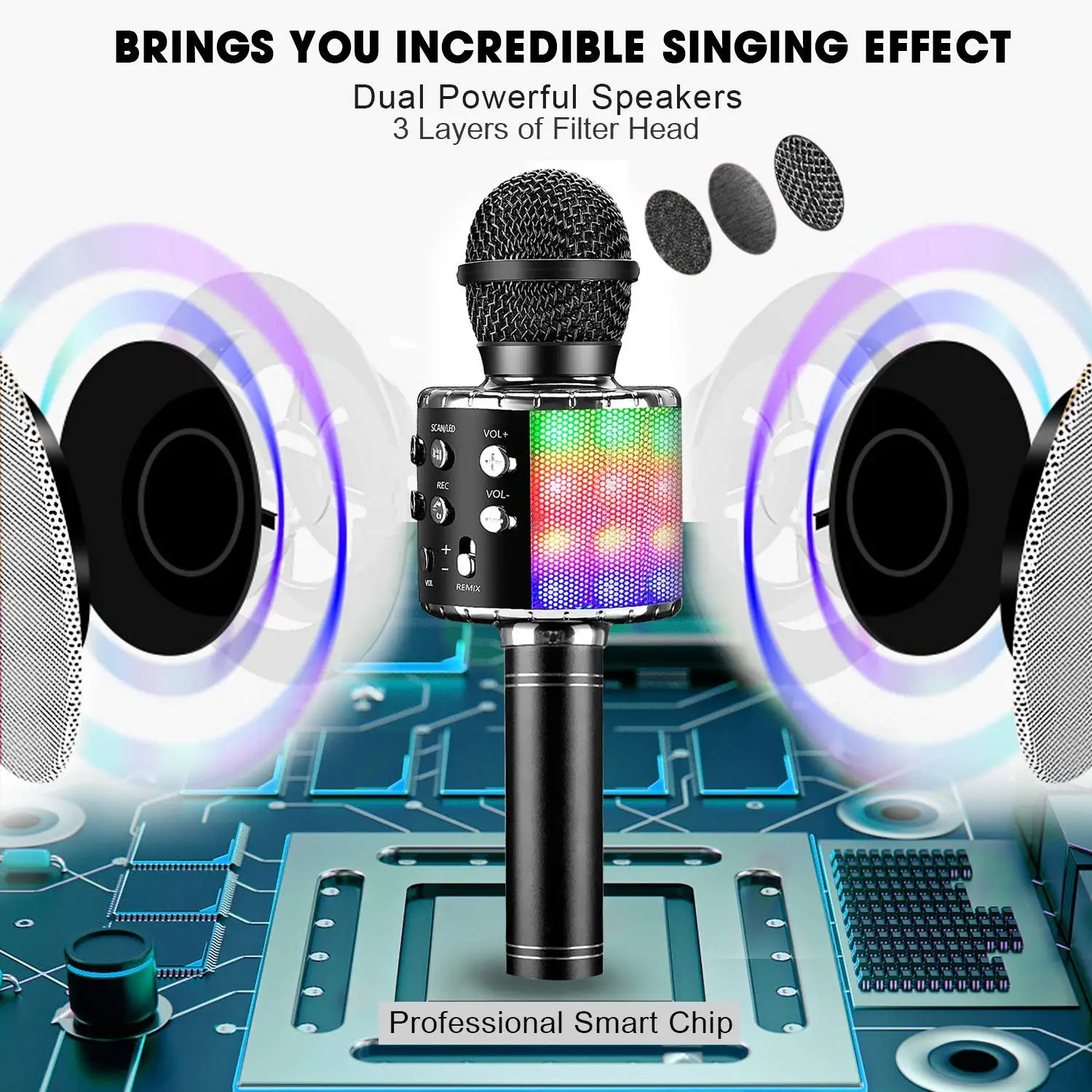 【 4 в 1 караоке микрофон】 Портативные Ручные беспроводные микрофоны можно использовать как микрофон, bluetooth-динамик, громкоговоритель, диктофон. Мини домашний KTV для воспроизведения музыки и пения в любое время.【Качественный звук звука и Высокая совместимость 】 профессиональный аудио процессор и система настройки, три слоя высокого снижения уровня шума, создание потрясающей среды живого звука KTV и чудесное эхо-Реверберация.【 2 способа Connection】 3,5 мм аудиоразъем и подключение по Bluetooth, беспроводной микрофон для караоке с легкостью можете подключить через Bluetooth или 3,5 мм аудио разъем к вашему iPhone/Android телефонов/планшетов Android/ПК. Вы также можете вставить tf-карту для использования микрофона.【Длительное время ожидания 】 встроенный литиево-ионный аккумулятор емкостью 1800 мАч, этот беспроводной микрофон для караоке с Bluetooth может работать более 5-6 часов после полной зарядки.[Лучшие подарки] уникальный подарок для детей и взрослых и идеальный подарок на Рождество, праздники и вечеринки. 1 год гарантии