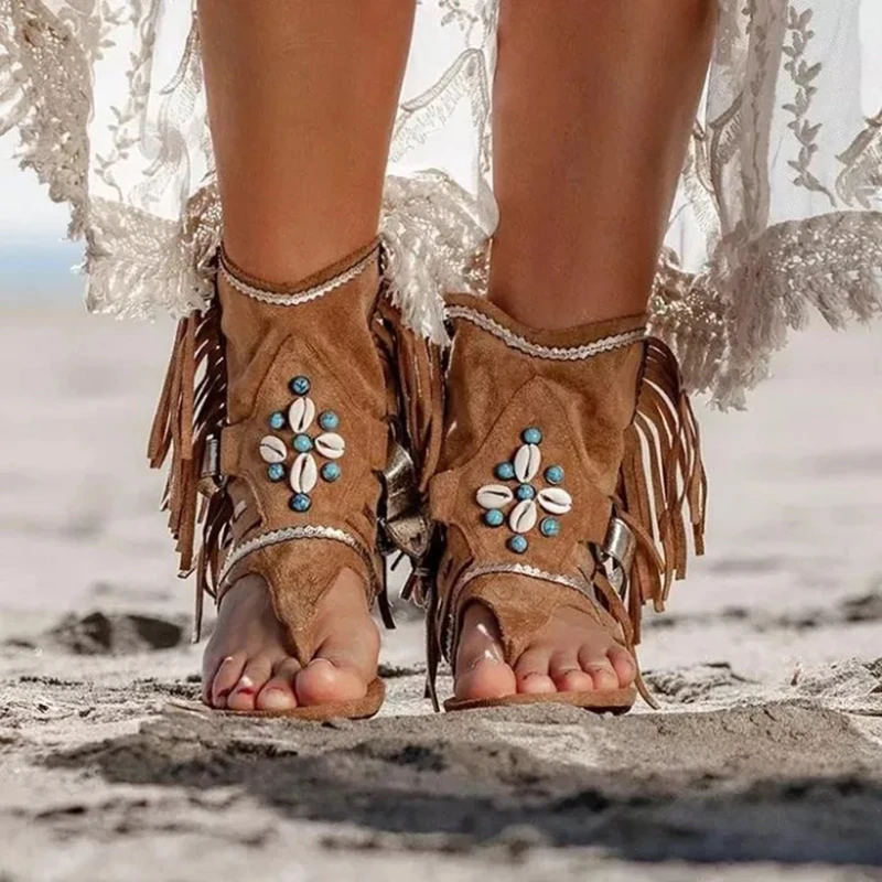 Европейские и женские новые повседневные стильные замшевые сандалии с бахромой на плоской подошве, пикантные римские сандалии с бусинами, винтажные универсальные ботильоны