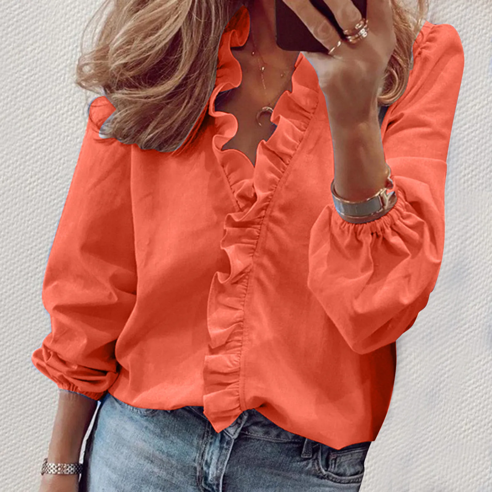 Модная пикантная Блузка с оборками, рубашка, повседневный однотонный топ с буквенным V-образным вырезом, повседневные летние женские блузки с длинным рукавом, пуловеры