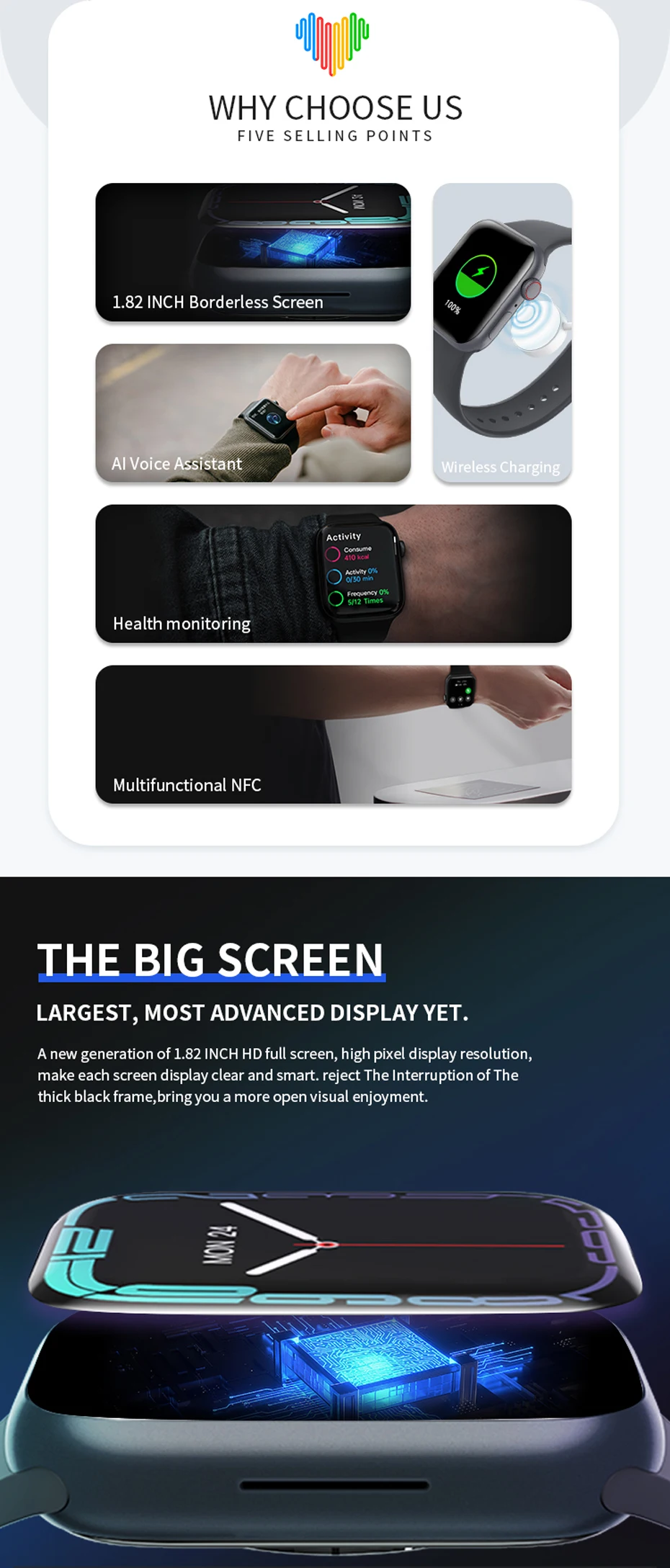 1. Карта доступа NFC:Просто Протяните руку и сделайте это одним пальцем2. Голосовой помощник3, обмен местоположением4, спортивный режим5. Функция здоровья6. Социальные функции7, 1,82 дюймов Большой экран nprecedented инноваций8, многофункциональный NFC | Беспроводная зарядка | Тест глюкозы в крови | Новый динамический UI | Голосовой помощник AI