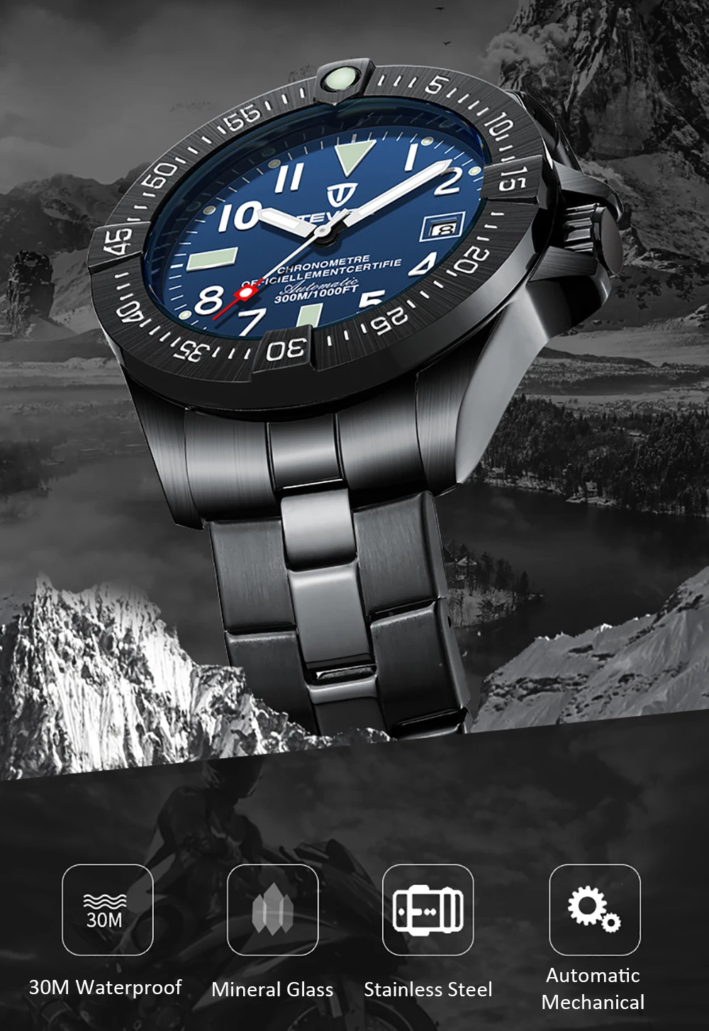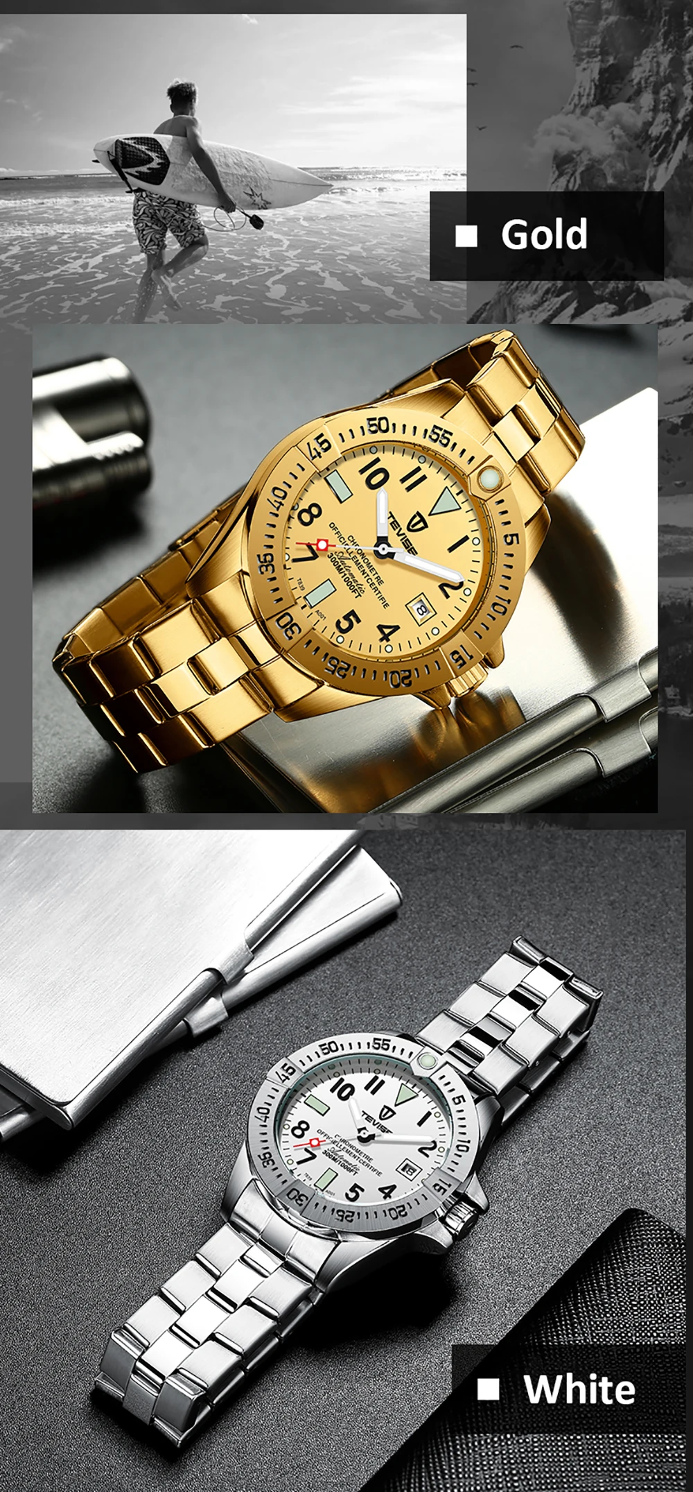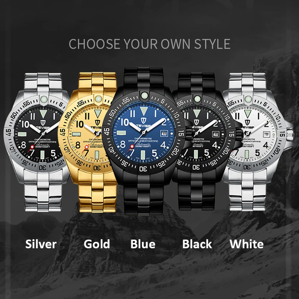 Особенности:Автоматическое механическое движение, Нет необходимости в батарее.Ремешок из нержавеющей стали прочный и удобный в носке.Отображение времени, высококачественные и классические мужские часы.Водостойкий(3 атм): Ежедневное Водонепроницаемость (не для душа и плавания).Идеально подходит для многих случаев. Это хороший партнер в вашей жизни! Функции: время, отображение календаря и светящиеся стрелки. Характеристики:Бренд: TEVISEТип механизма: механическийЦвет: серебристый/золотой/синий/черный/белыйФорма циферблата: круглаяМатериал корпуса: металлМатериал ремешка: нержавеющая стальМатериал зеркала: минеральное стеклоТип застежки: ПряжкаПол: мужчинСтиль: деловой и модныйВодостойкий уровень: 3 АТМЦиферблат Диаметр: 4,1 см/1.61inЦиферблат Толщина: 1,5 см/0.59inРемешок для часов Ширина: 2,2 см/0.87inДлина ремешка: 22 смВес часов: 161 гПосылка Размеры: 16*6*4 см/6,30*2,36 * 1.57inВес посылка: 166 г