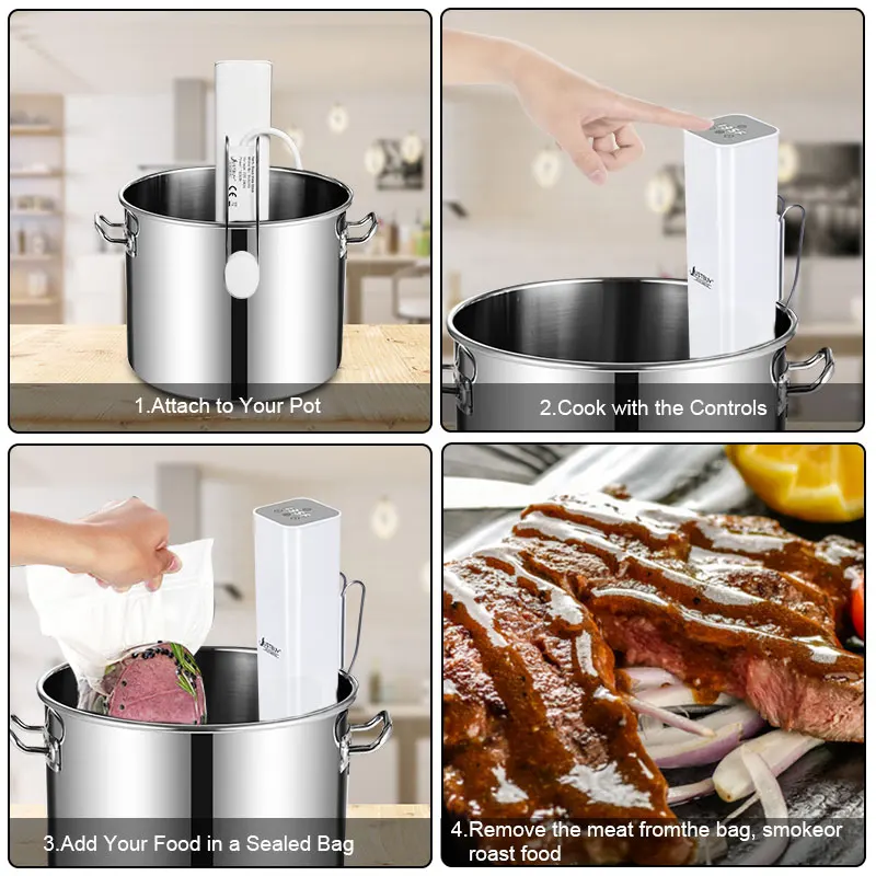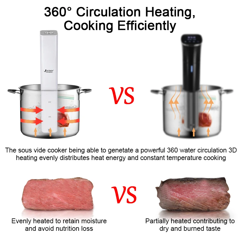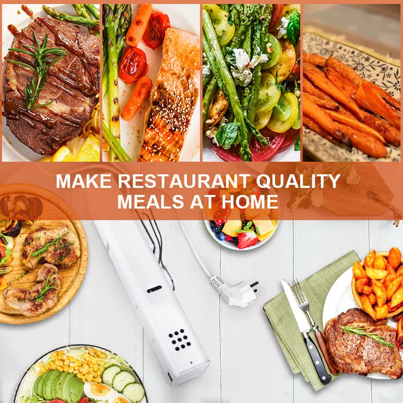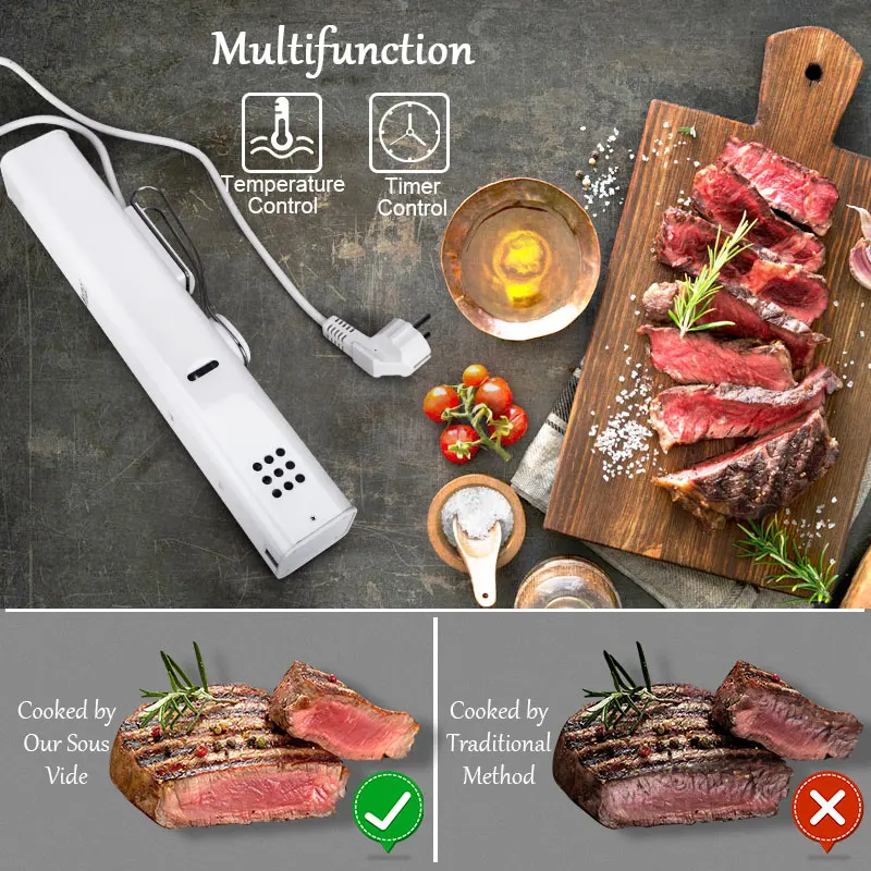Быстрый нагрев циркулятора-, Sous vide нагревает воду быстро, быстрее получить температуру. Этот сохраняет ровную и стабильную температуру, помогает готовить еду при определенной температуре. И улучшенный циркулятор также может обрабатывать гораздо большие водяные ванны, чтобы позволить приготовлению большего количества пищи за один раз.