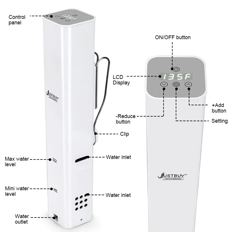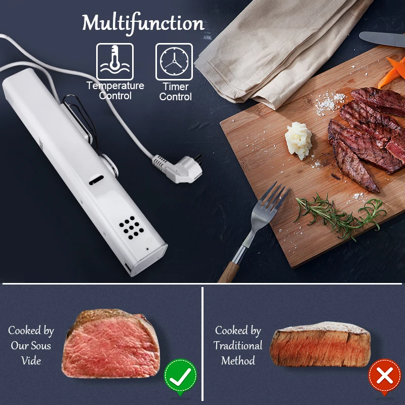 Профессиональная нежная и сочная готовка-Плита может контролировать температуру приготовления в любой степени (32degF-203degF) под температурой кипения воды. Нагревает еду до постоянной температуры и сохраняет ее, лучший способ приготовления мяса нежной любой сочной, здоровой и вкусной жизни! Рекомендации: стейк (135 дегф 1/2 часа), куриная грудка (143 дегф 35 минут), яйца (167 дегф 13 минут), морковь (185 дегф 25 минут)
