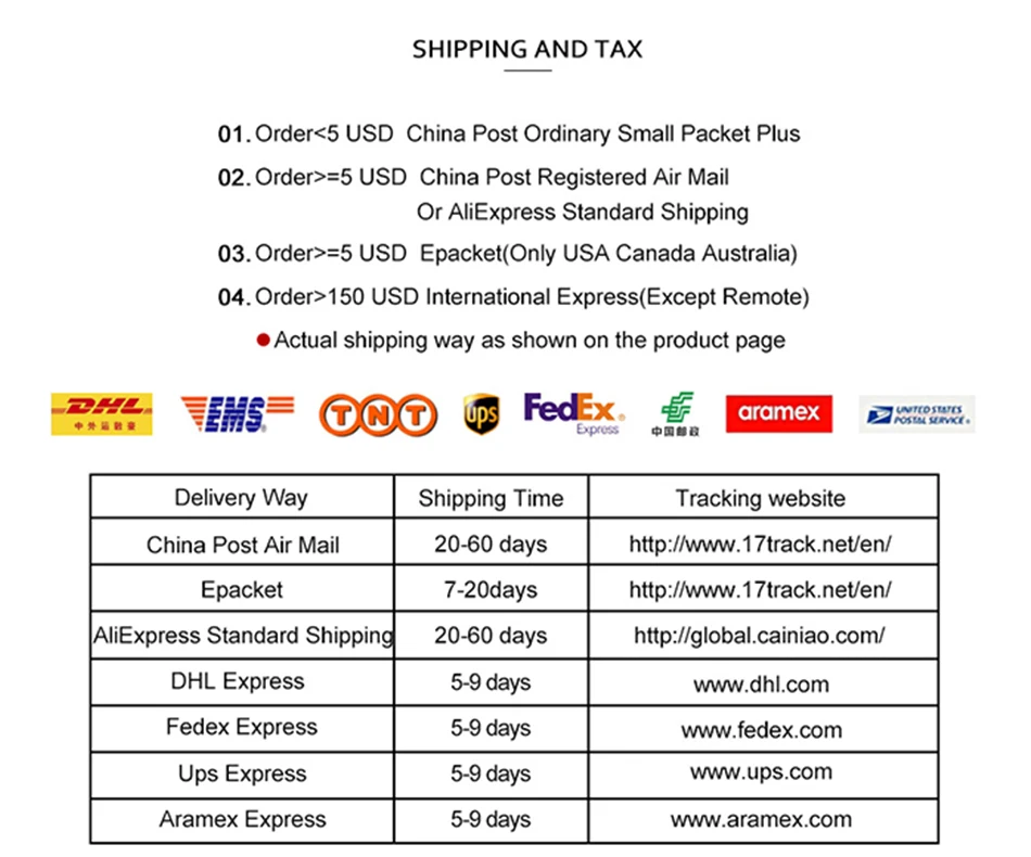 2. Посылки будут отправлены в соответствии с методом доставки, выбранным клиентом. Мы также можем предоставить DHL,Fedex и EMS экспресс-доставку, поэтому, пожалуйста, свяжитесь с нами, когда вы хотите его отправить экспресс-почтой