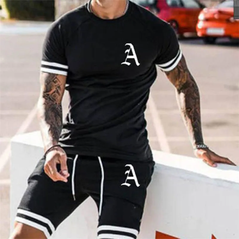 Летний мужской спортивный комплект, свитшот с круглым вырезом, Мужская футболка в уличном стиле, однотонные повседневные шорты с 3d принтом и надписью A
