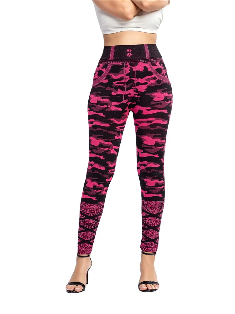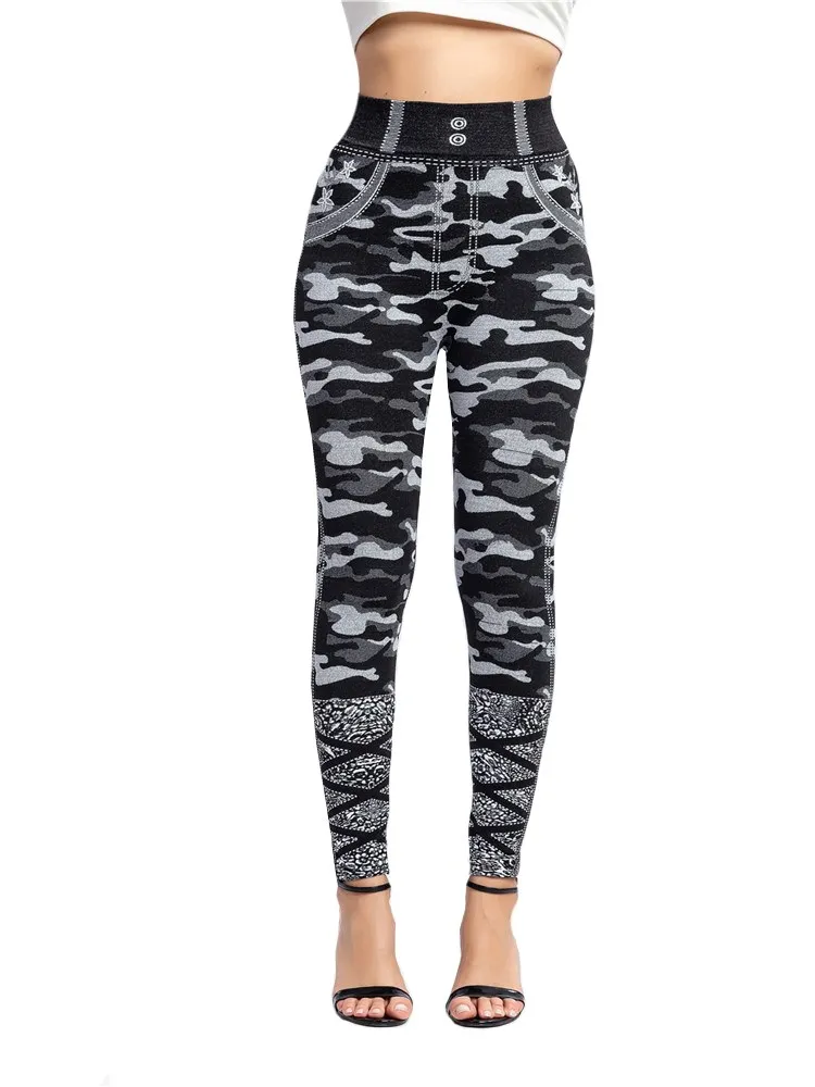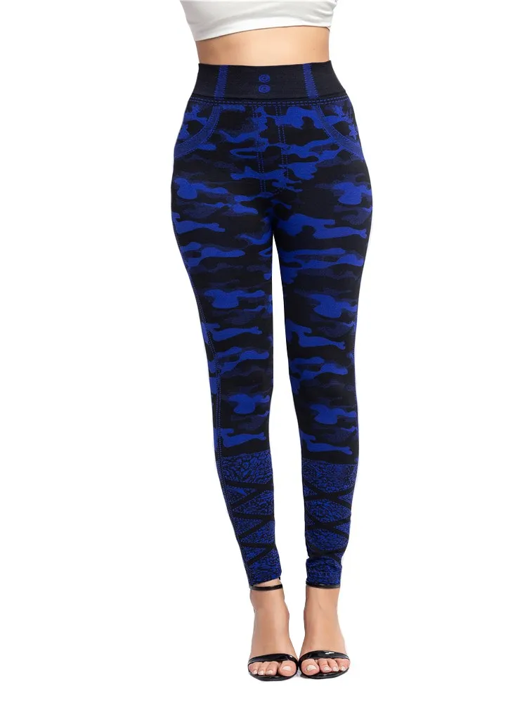 Женские Бесшовные камуфляжные джинсовые леггинсы YRRETY, спортивные колготки с высокой талией, эластичные штаны для тренировок и фитнеса, эластичные джеггинсы с принтом