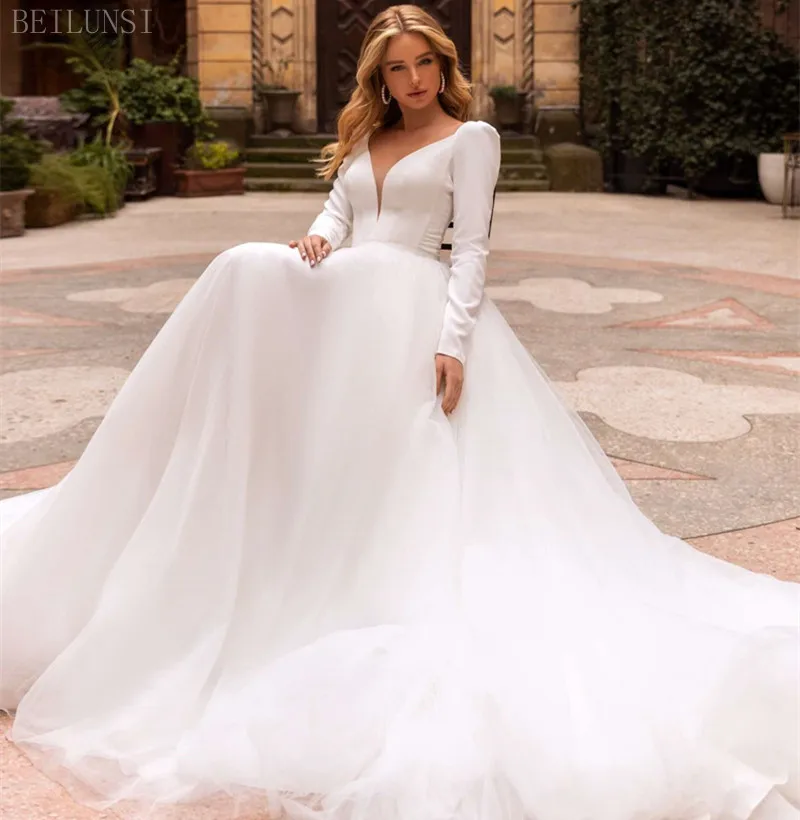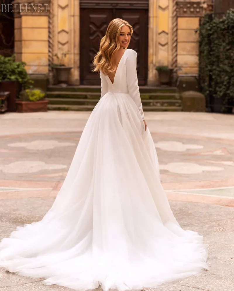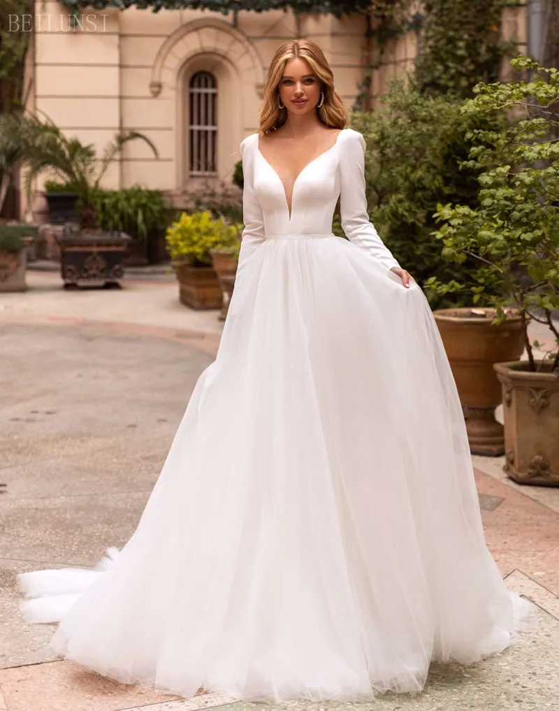 Простое свадебное платье, модель 2022 года, трапециевидная юбка с V-образным вырезом и длинным рукавом, дешевые фотообои для невесты