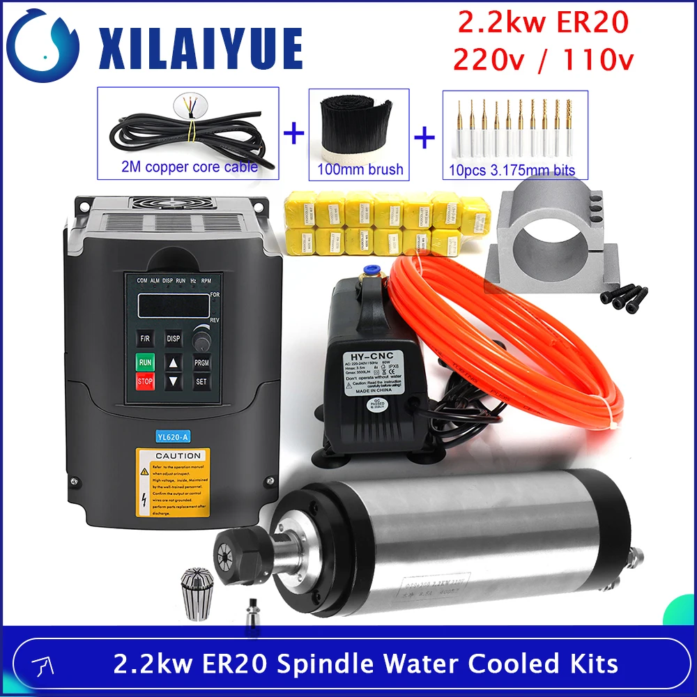 Комплект 5:1 шт. 2.2 кВт шпиндель с водяным охлаждением + 2 кВт инвертор + 1 водяной насос + 1 шт. 5 м водопроводные трубы + 1 шт. 80 мм зажим + 13 шт. ER20+2 м трехъядерный медный кабель+100 мм кисти+10 шт. концевые фрезы(Различный диаметр резки: 0,8 мм, 1,0 мм, 1,2 мм, 1,4 мм, 1,6 мм, 1,8 мм, 2,0 мм, 2,2 мм, 2,5 мм, 3,0 мм)