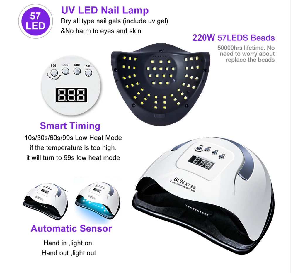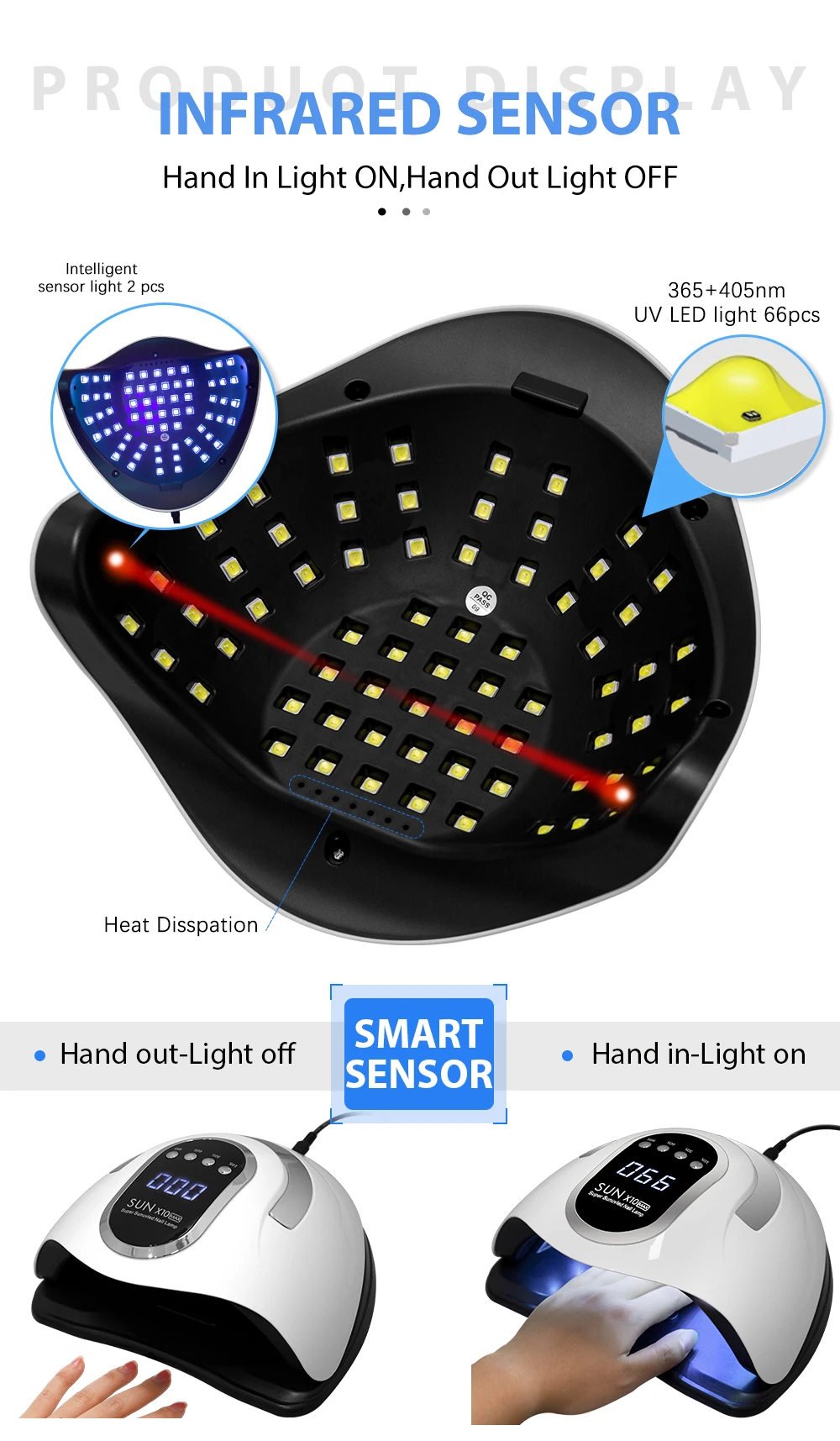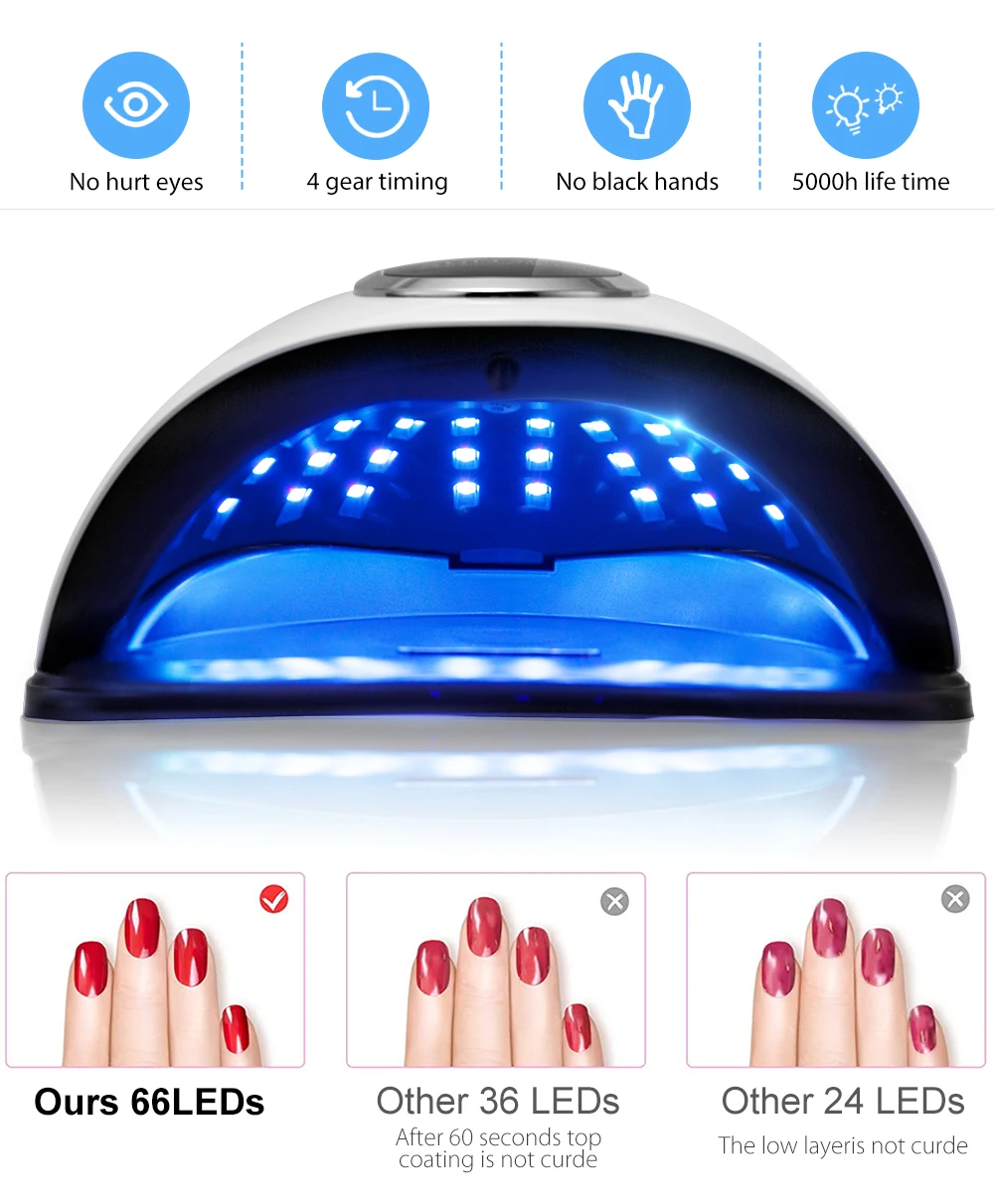 Можно высушить практически все гели для ногтей:Используется для лечения различных гелей для ногтей, таких как УФ-строитель ногтей и базовые гели. (Нельзя использовать для сушки лака для ногтей.)Автоматическая индукция:Он начнет работать автоматически, если вы положите руки в эту машину без нажатия кнопки времени.3 вида настройки времени:10 секунд, 30 секунд и 60 секунд для выбора времени и 99 секунд для максимального рабочего времени без нажатия кнопки времени.Режим низкого нагрева:99 секунд для режима низкого нагрева, защищая кожу ваших рук.Отсчет и Хронометраж:Он будет отсчитываться, если вы нажмете кнопку настройки времени. Функция хронометража начинается, если вы выбираете режим низкого нагрева или автоматический индукционный режим.