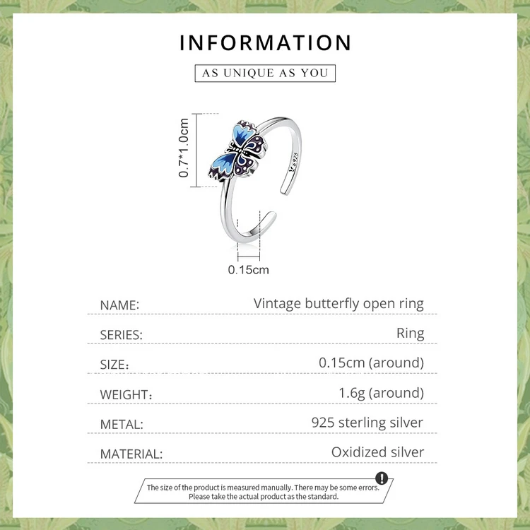 ❤[Опишите] Открытое кольцо из окисленного серебра имеет реалистичную бабочку в центре. Это модный и уникальный в винтажном стиле цвет, добавляя удовольствие повседневной одежде.❤[Материал] 925 пробы серебристого и эмалевого процесса и окисленного серебра, этот серебряный шарм не содержит никель, не содержит свинец, не содержит кадмия, гипоаллергенен. Гарантия качества, приятный для кожи, удобный и удобный в носке, не вредный для здоровья.❤[Мастерство]:S925 + эмалированный процесс + окисленное серебро❤[Параметры]: Ширина: 0,15 см, Бабочка, размер: 0,7*1,0 см❤[В подарок] 1 шт. серебряное кольцо 925 пробы и Подарочный мешочек, который является идеальным подарком.