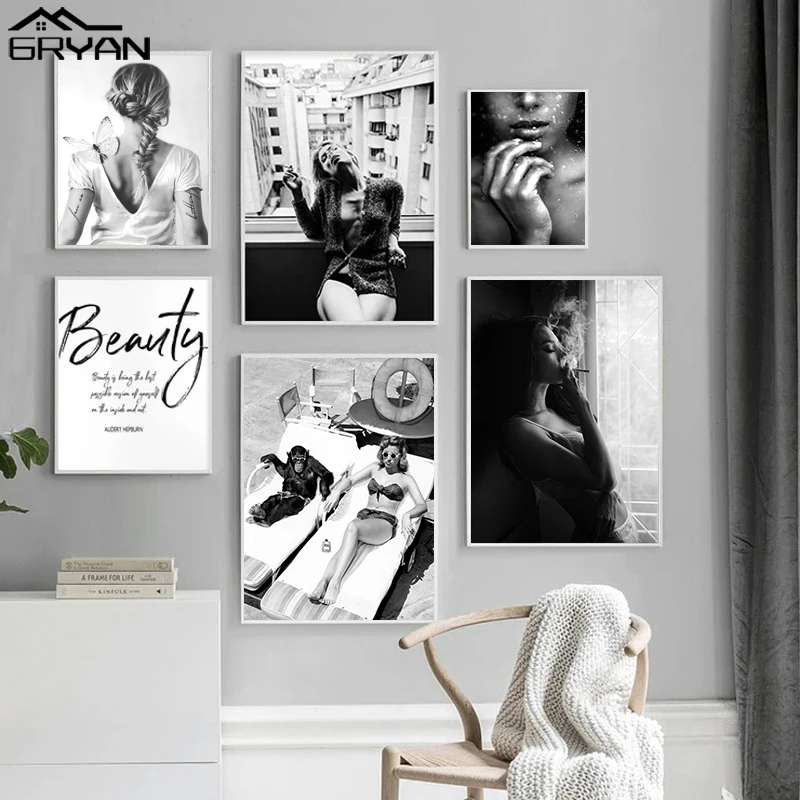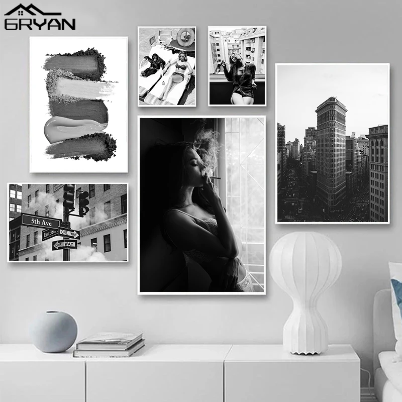 Черно-белый плакат с сексуальной женщиной для курения макияж выделение холст печать живопись ретро здание Нью-Йорка уличный знак картина