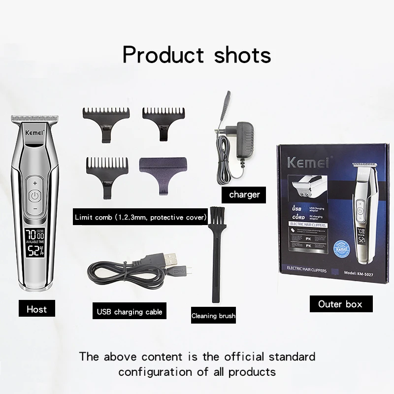 Модель: KM-5027Напряжение: 110-240 ВЧастота: 50/60 ГцМощность: 5 ВтВремя зарядки: 2 часаВремя использования: 270 минутУпаковочный лист: 1 шт. * машинка для стрижки волос, 1 шт. * Защитная крышка лезвия, 3 шт. * Концевая расческа, 1 шт. * щетка для очистки, 1 шт. * usb-кабель для передачи данныхПримечание: Из-за ограничений на воздушную перевозку жидкости не могут быть транспортированы, поэтому масляные бутылки не включены в посылка, пожалуйста, обратите внимание.