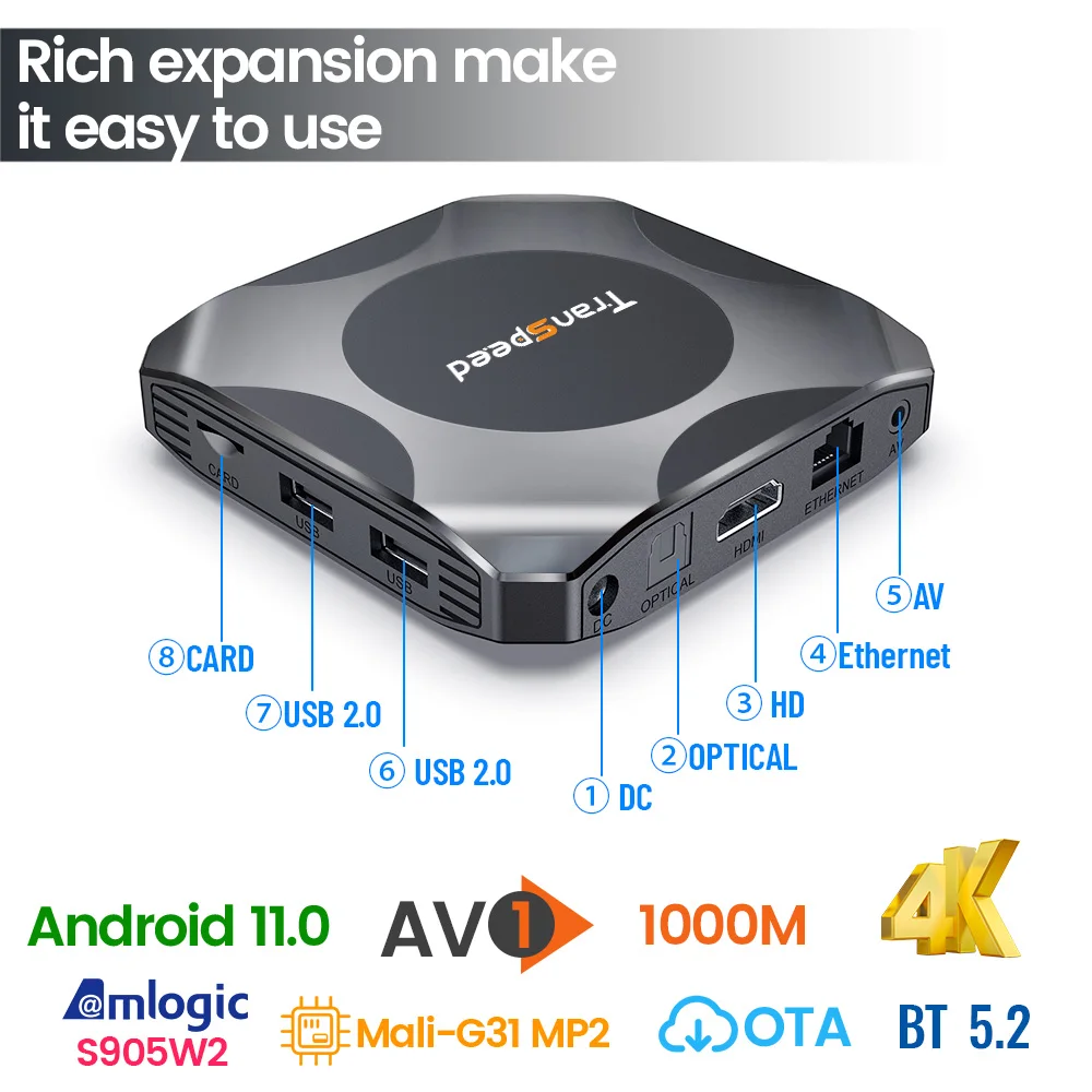 ТВ-приставка Transpeed Android 11 BT5.2 3D Быстрый двойной 1000 м WiFi 4K 4 Гб 64 ГБ 32 ГБ медиаплеер Amlogic S905W2 Mali G31 AV1 телеприставка