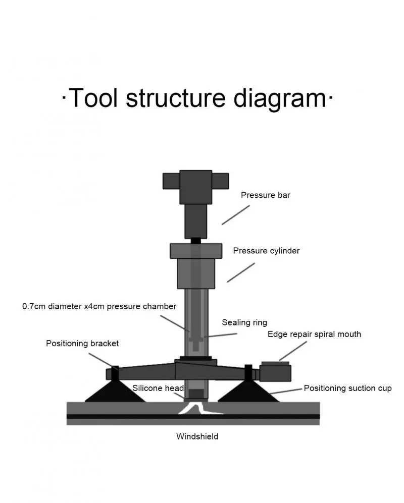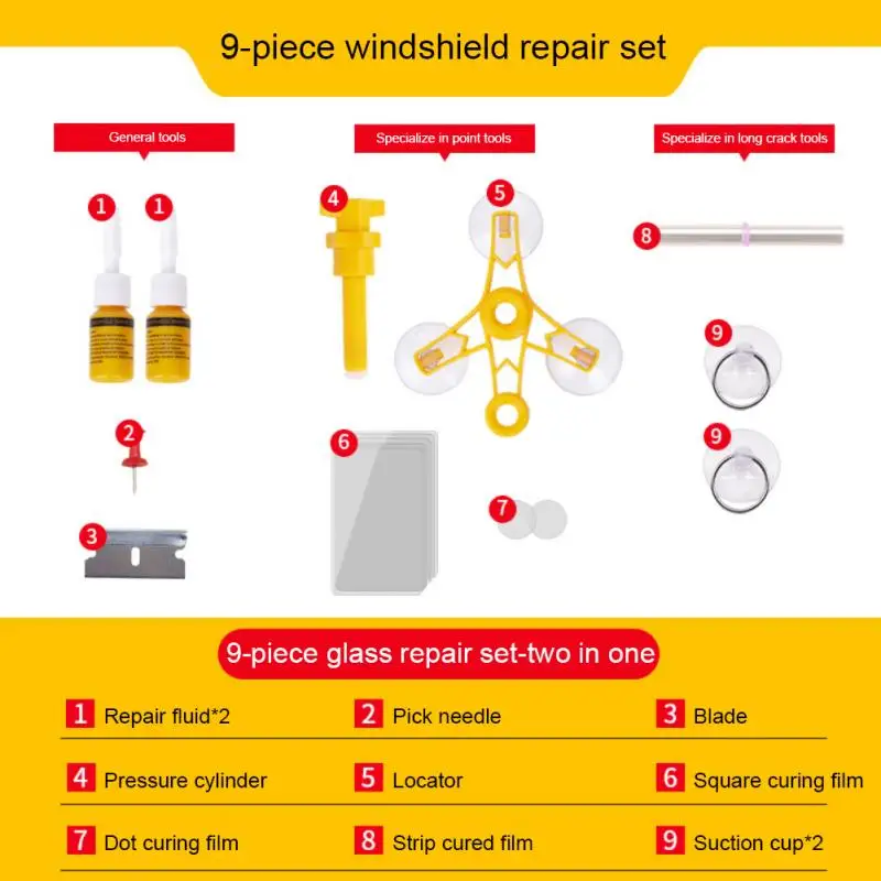 В комплект входит: 1 цилиндр давления, 1 локатор, 1 лента отверждающая пленка, присоска * 2, 1 квадратная отверждающая пленка, 1 круглая отверждающая пленка, жидкость для ремонта * 2, 1 Игла для сбора, 1 лезвие (точечный Ремонт + длинный ремонт трещин)