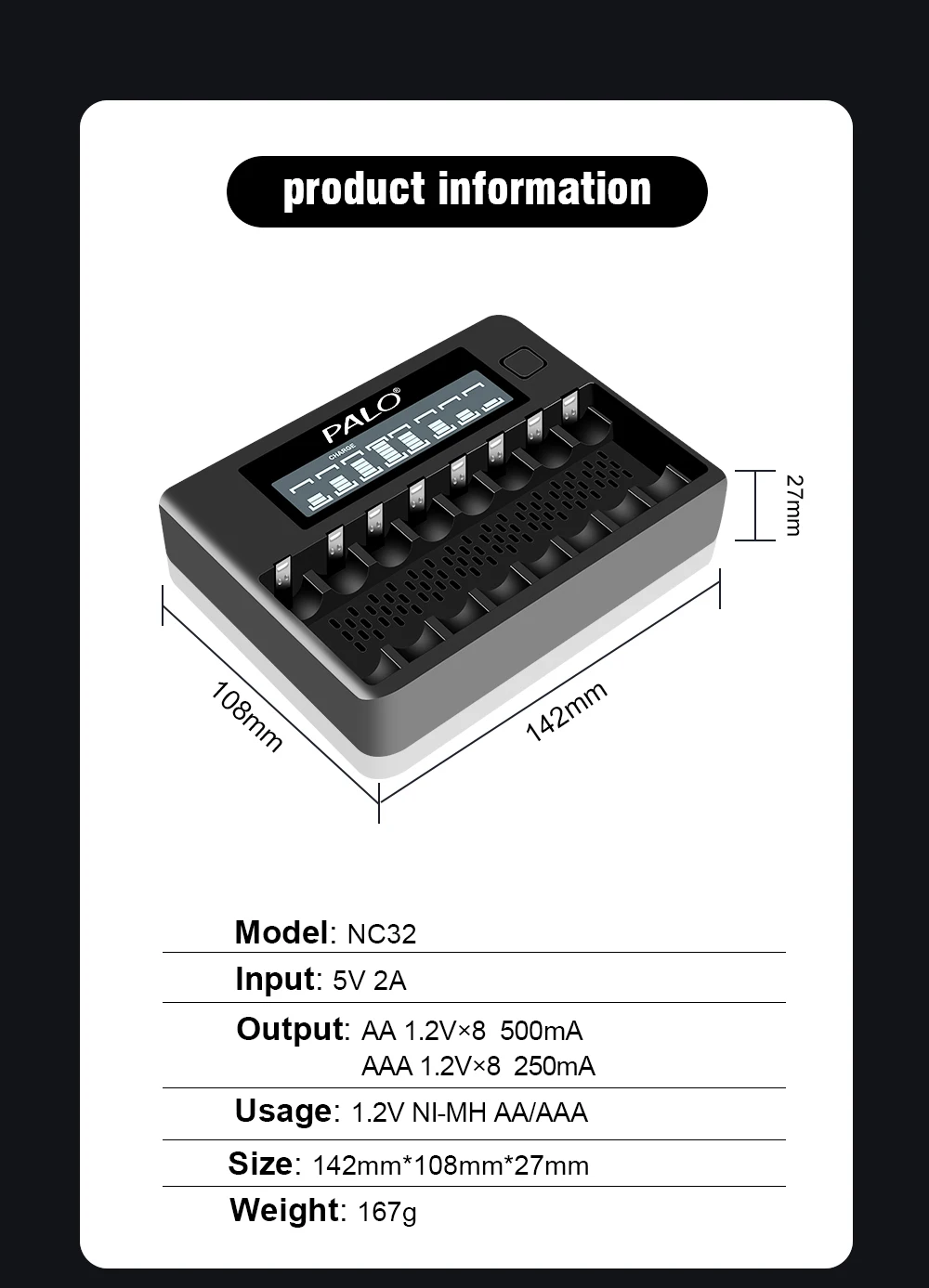 Спецификация:1. Это зарядное устройство можно заряжать портативным зарядным устройством, на возраст от 1 года до 8 лет шт 1,2 V AA AAA металл-гидридных или никель Перезаряжаемые батареи.2. Умный чип контролирует процесс зарядки.3. ЖК-экран показывает процесс зарядки.4. Независимый зарядный канал, множественная защита, поддержка быстрого выпуска.5. В конце процесса зарядки Встроенный микрокомпьютер преобразует режим зарядки от быстрой зарядки в непрерывную зарядку, обеспечивает полную зарядку аккумуляторов и предотвращает чрезмерную зарядку;6. Многофункциональная функция защиты от перезарядки и переразряда, короткого замыкания, полярности и т. д. Он может точно определить сломанные батареи с гораздо большей безопасностью.7. Постоянный ток предотвращает колебания тока, обеспечивает безопасность зарядки;8. Зарядное устройство строго контролирует максимальное время зарядки, гарантирует одновременную зарядку аккумуляторов;9. Функция автоматического распознавания: Уникальный алгоритм обнаружения плохих или дефектных ячеек, автоматически обнаруживает незаряжаемый или одноразовый аккумулятор и прекращает зарядку;10. Отображение данных только для справки, пожалуйста, обратитесь к профессиональному инструменту для получения более точных данных.