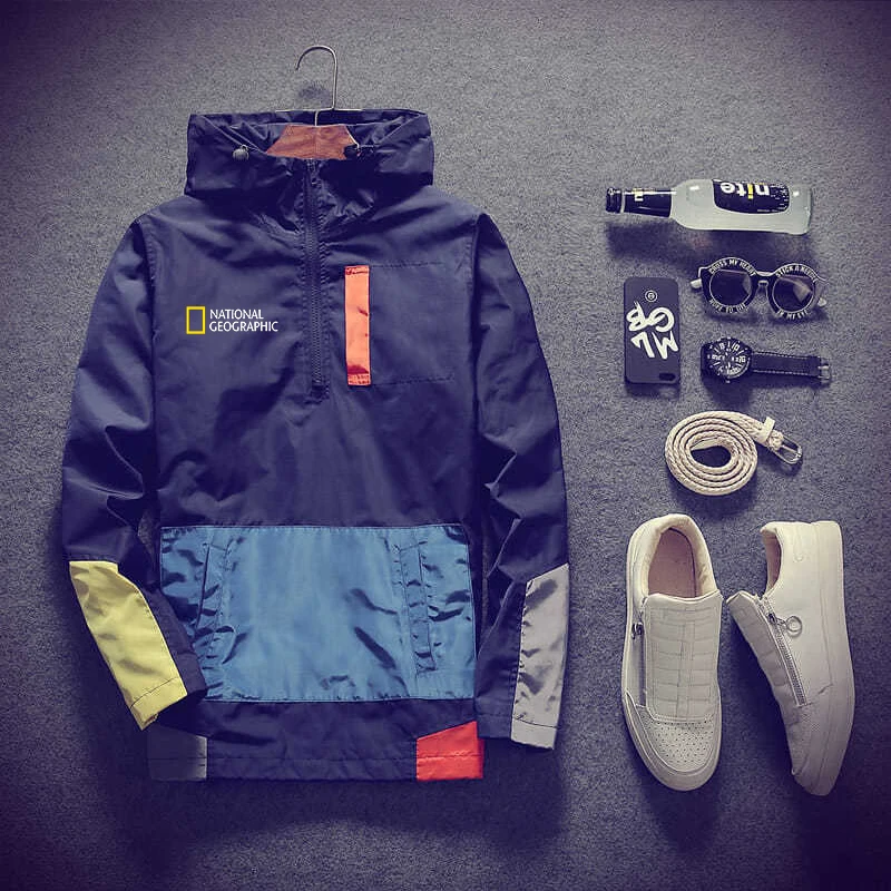 Новинка весна-осень 2022, мужская повседневная куртка-бомбер на молнии с капюшоном National Geographic, модная ветровка в стиле пэчворк