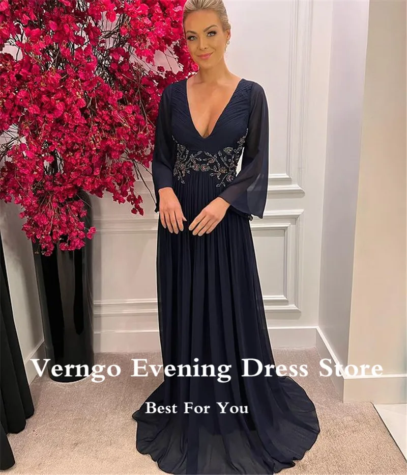 Женское шифоновое вечернее платье Verngo, темно-синее платье с длинным рукавом, аппликацией и V-образным вырезом, платье до пола для матери, вечевечерние НКИ, выпускного вечера