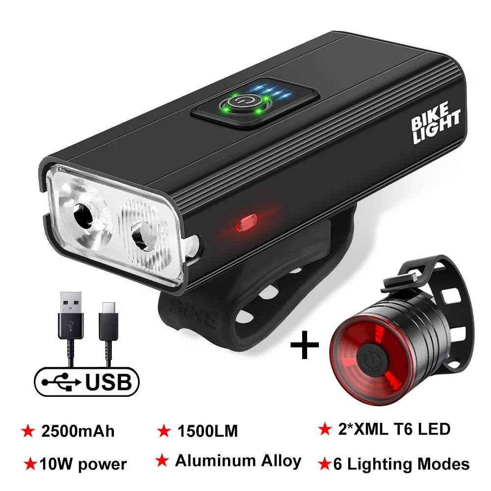 Новый светодиодный велосипедный фонарь T6, 10 Вт, 1500 лм, зарядка через USB, дисплей мощности, Передний фонарь для горного и дорожного велосипеда, задний фонарь, комплект с вспышкой