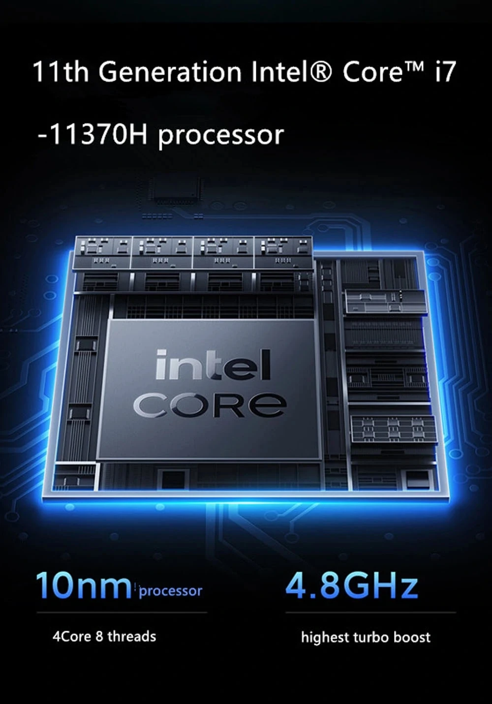 Intel® Core 11 поколения™I7-11370H процессорОснование турбо частота 3,3 ГГцСамая высокая частота ядра 4,8 ГГцЧетырехъядерный и восьминиточный процессорКэш L3 12 МБ