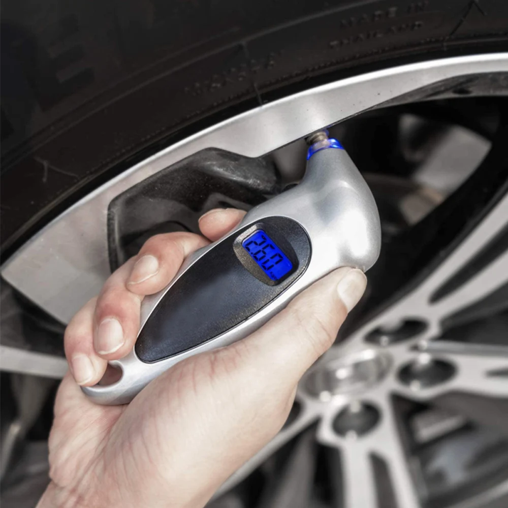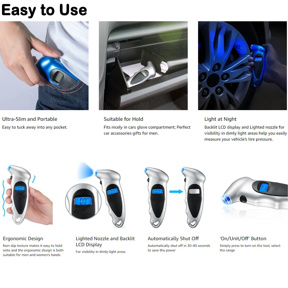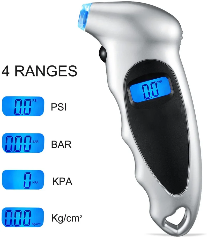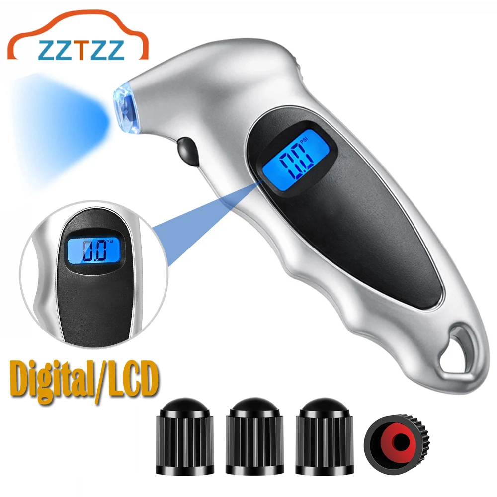 Цифровой манометр в шинах 150 фунткв. Дюйм, 4 настройки для автомобиля, грузовика, велосипеда с ЖК-дисплеем с подсветкой и 4 колпачками для клапанов в подарок