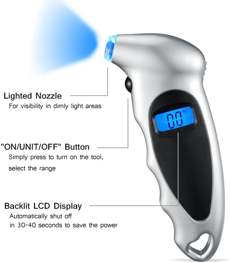 2. Насадки легко формирует запечатываем штока клапана на schrader (Шрадер) клапаны, быстрые и точные показания в 0,1 с шагом; 4 настройки с диапазон: 0-150PSI / 0-10Bar / 0-10Kgf/см² или 0-1000KPA.