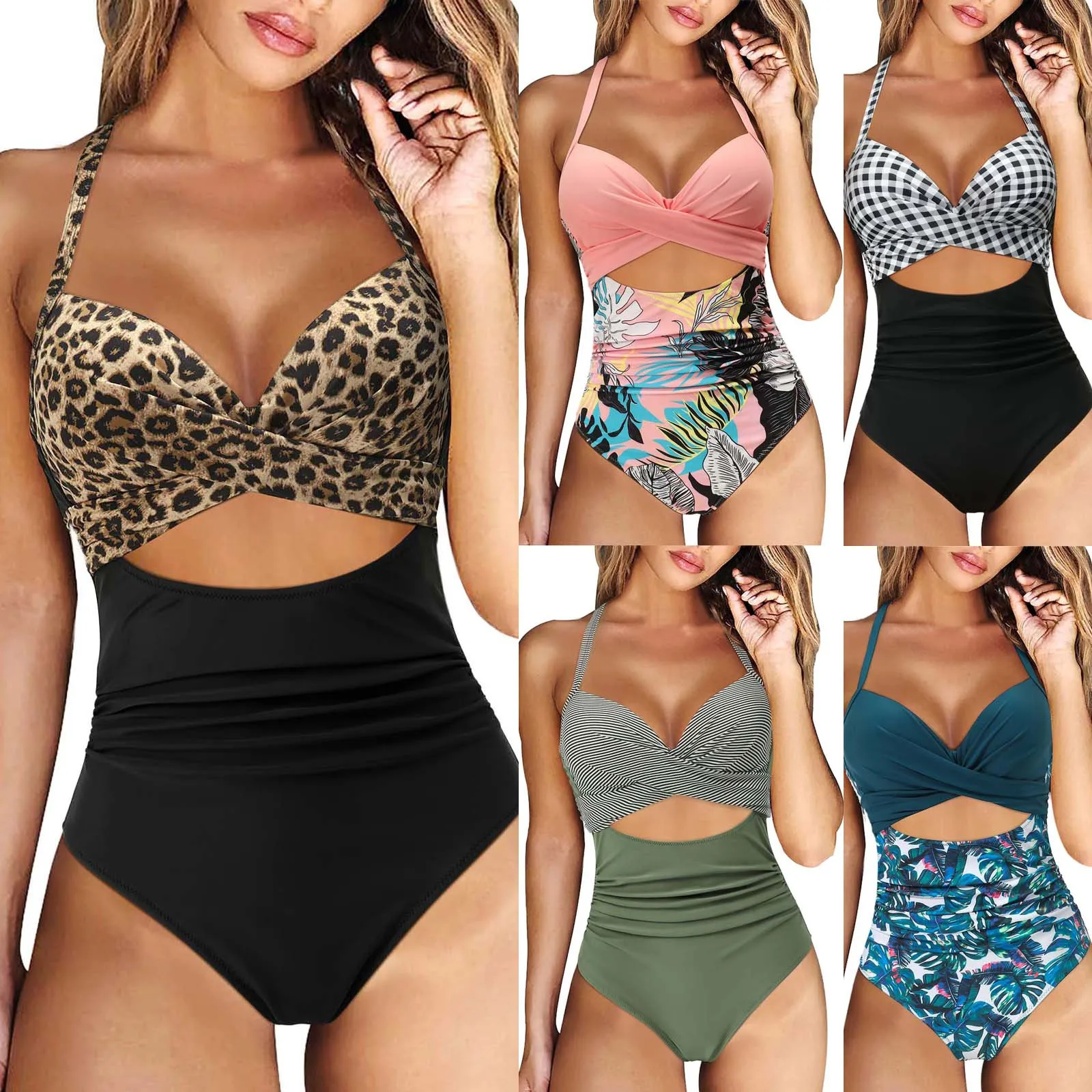 Женский слитный купальник пуш-ап с бретелькой через шею, купальный костюм с принтом в стиле пэчворк, бразильский пляжный купальник с высокой талией, монокини
