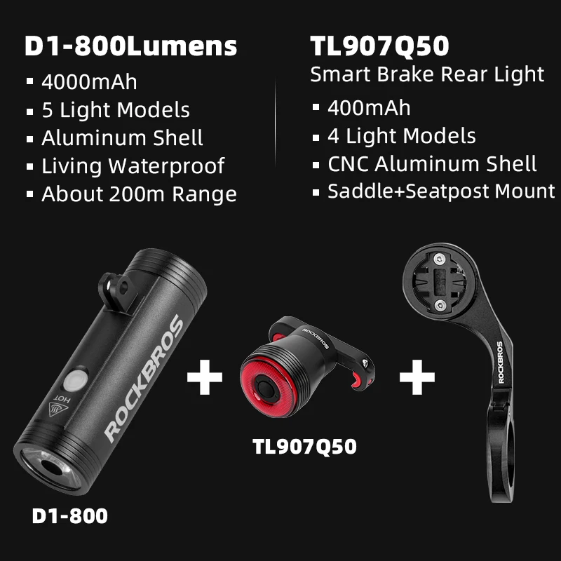 Бренд: ROCKBROSАккумулятор: около 2000 / 4000 мАчРежим: 4 / 5 режимов (одиночный + двойной щелчок изменение режима светильник)Вес: около 118 г Характеристика:Подъемные огниМногофункциональный кронштейн 400 люменов и 800 люменовТеплоотдача из алюминиевого сплаваIPX3 ВодонепроницаемыйUSB зарядное устройствоАкриловая линза, не ослепляющая, обрезающая линия