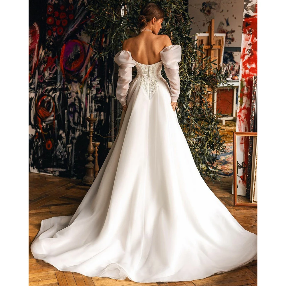 UZN шикарные цвета слоновой кости из органзы с атласной принцессы Свадебные платья Милая Длинные Пышные рукава Свадебные платья с аппликацией из кружева невесты платье Robes de mariée