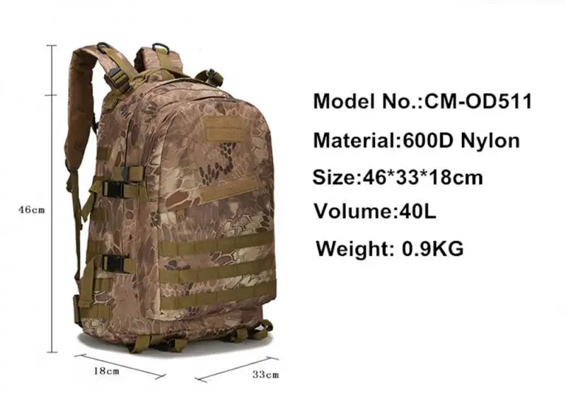 Функции: трехмерная вентиляция, декомпрессия, переноска, научный вес подшипника, предотвращение напряжения. Наплечный ремень эффективно подходит для положения тела и помогает сбалансировать напряжение. Вместительное пространство, которое может вместить журналы формата А4, планшетные компьютеры, зонты, IPad и другие предметы для путешествий. Верх корпуса сумки снабжен фиксированным ремешком, который может стабилизировать содержимое сумки. Нейлоновая ткань высокой плотности внутри, в сочетании с водонепроницаемым внутренним покрытием Pu, имеет более эффективный эффект использования. Конструкция подкрепления нижней части с мощной системой лямки MOLLE полностью улучшает грузоподъемность сумки и более практична. Высокопрочная головка на молнии, не легко ломается, холодная и высокая термостойкость, прочная и долговечная. Боковая регулируемая толщина 3D сумки застежка, прочная, холодная и высокая термостойкость.