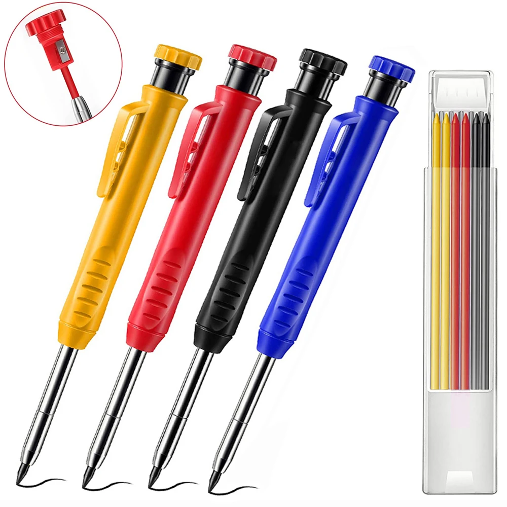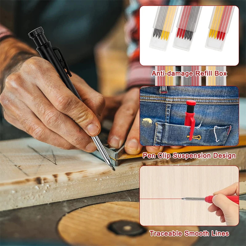Твердый набор карандашей для плотника с запасными наконечниками для деревообработки с глубоким отверстием механический инструмент для маркировки карандашей со встроенной точилкойХарактеристика:1. Производитель глубоких отверстий: время проектирования карандаша плотника с глубоким отверстием составляет 45 мм и наконечник носа иглы, достигая труднодоступных мест, в то время как другие знаки плотника не могут. Подходит для сквозных отверстий или других узких зон.2. Точилка для точной маркировки: точилка вкручивается в верхнюю часть механического карандаша для рисования, и она не будет потеряна, и ваш механический карандаш всегда будет заточен для хорошей точности3. Механический карандаш: Карандаш Плотника не соскальзывает пальцы с карандаша и повторные следы уменьшат боль; Дизайн зажима ручки можно легко повесить на сумку, легко использовать и не легко потерять, повышение эффективности, подходит для строительства и масонов4. Отметки на различных поверхностях: твердые деревообрабатывающие карандаши можно нарисовать на металле, пластике, стекле, дереве, бумаге и т. Д.; Карандаши для рисования долговечны и прослеживаются везде, прочнее, чем жесткий свинец; желтый цвет может быть на темных поверхностях, которые не являются привлекательными для серого свинца, нарисованные на повторяющихсяСпецификация:Размер: 15 смМатериал: АБС-пластикЦвет: красныйУпаковочный лист:1 * деревообрабатывающий карандашИли1 коробка * карандаш свинцаИли1 * карандаш и 1 коробка * 3 цвета заправкиПримечание:Заправка внутри оригинального карандаша черного цвета.Если вам нужно изменить цвет карандаша и пополнять его при покупке набора, пожалуйста, свяжитесь с нами или сделайте заметку при оформлении заказа.
