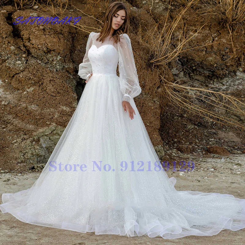 Женское свадебное платье с пышными рукавами, длинное ТРАПЕЦИЕВИДНОЕ...