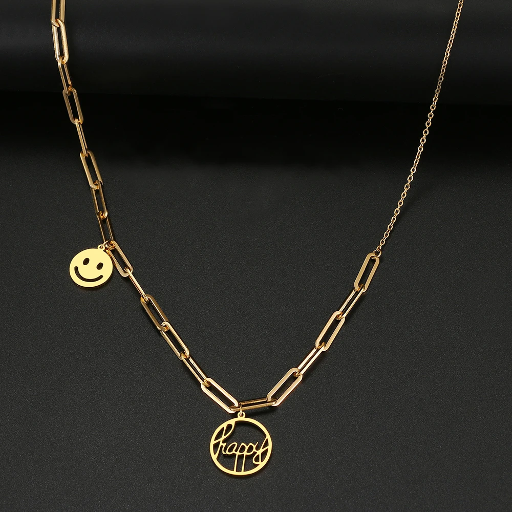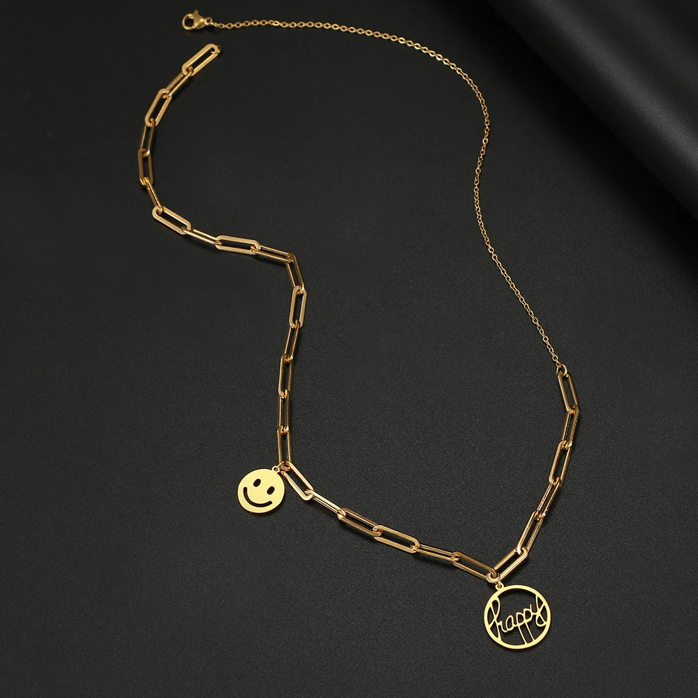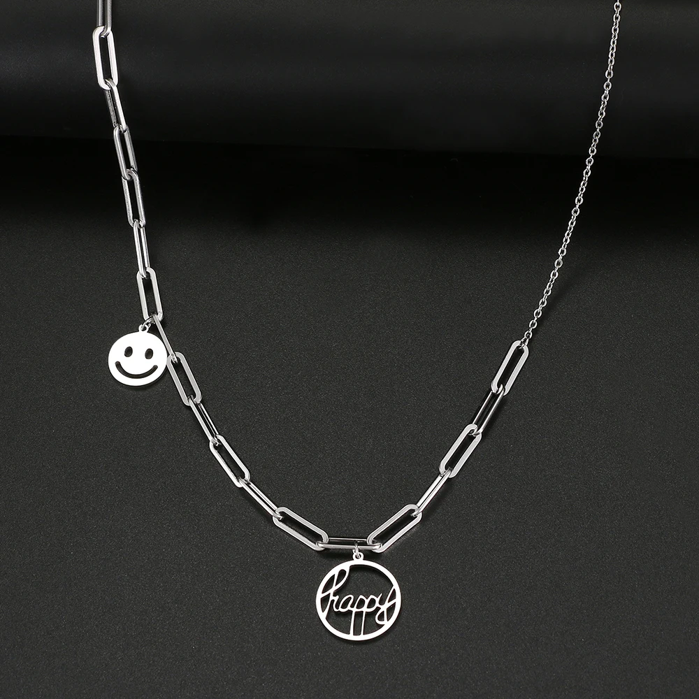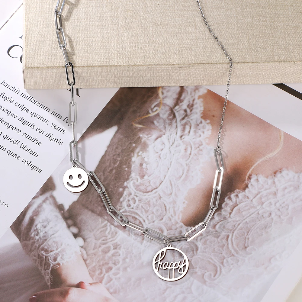 Ожерелья из нержавеющей стали, стильная цепочка с зажимом для бумаги, подвеска с надписью Happy Smile, модное ожерелье-чокер для женщин, ювелирные изделия, подарок Вечерние