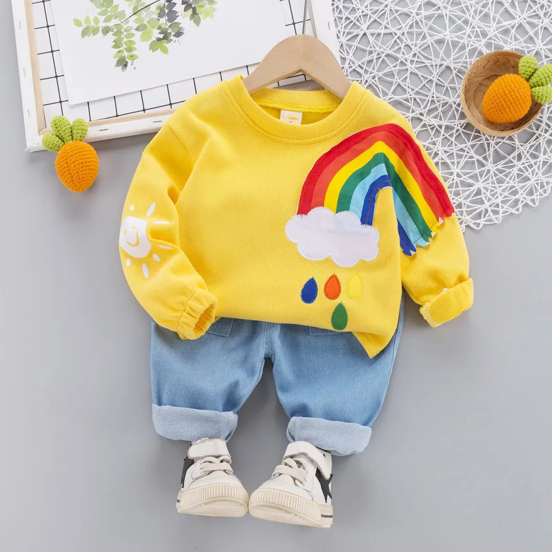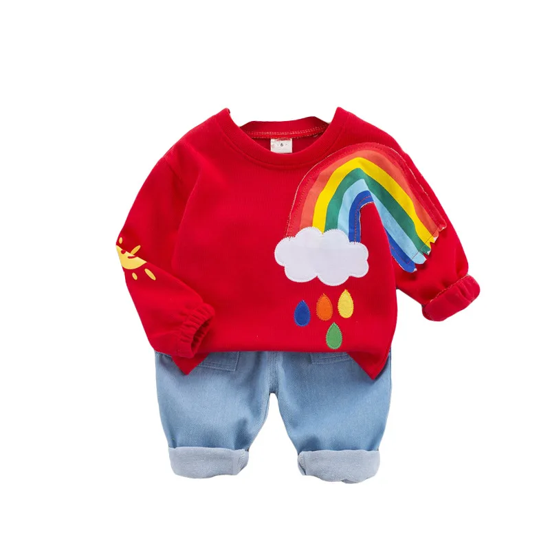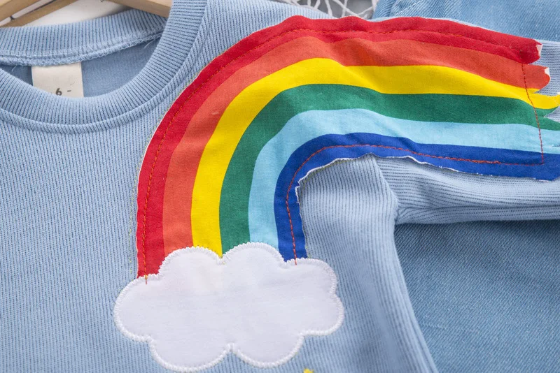 OLEKID 2022 весенне-осенний детский комплект одежды для девочек с длинным рукавом Радужная Толстовка джинсы с вышивкой штаны для маленьких девочек комплект одежды