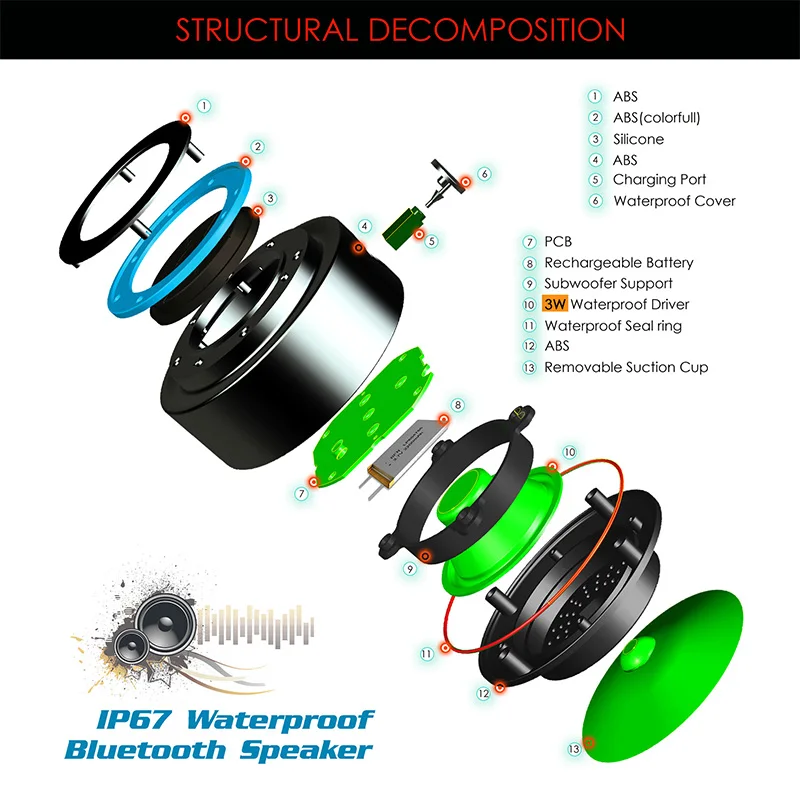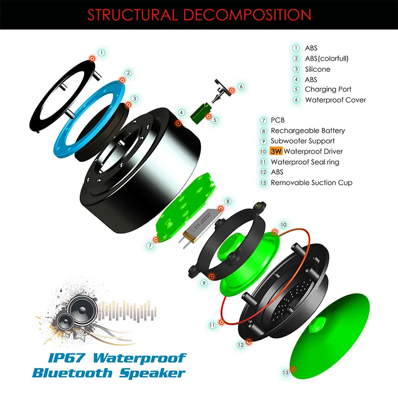 IP67 класс водонепроницаемый беспроводной Bluetooth Душ Громкая связь Ноутбук душ FM радио Громкоговоритель Мини Ванная комната аудио беспроводной радио Предупреждение: Обновленная версия с радио. Стандартная версия без радио. Характеристики: 1. Поддержка громкой связи 2. Версия Bluetooth: V3.0 3. Рабочий диапазон: до 10 м-15 м 4. Время работы: 3-8 часов 5. Время зарядки: 2-3 часа 6. Выходная мощность: 3 Вт 7. Вход Напряжение: 3,7 V-4,2 V 8. Выходное напряжение: 4,8 V-5,5 V 9. Материал: алюминиевый сплав и АБС Особенности: