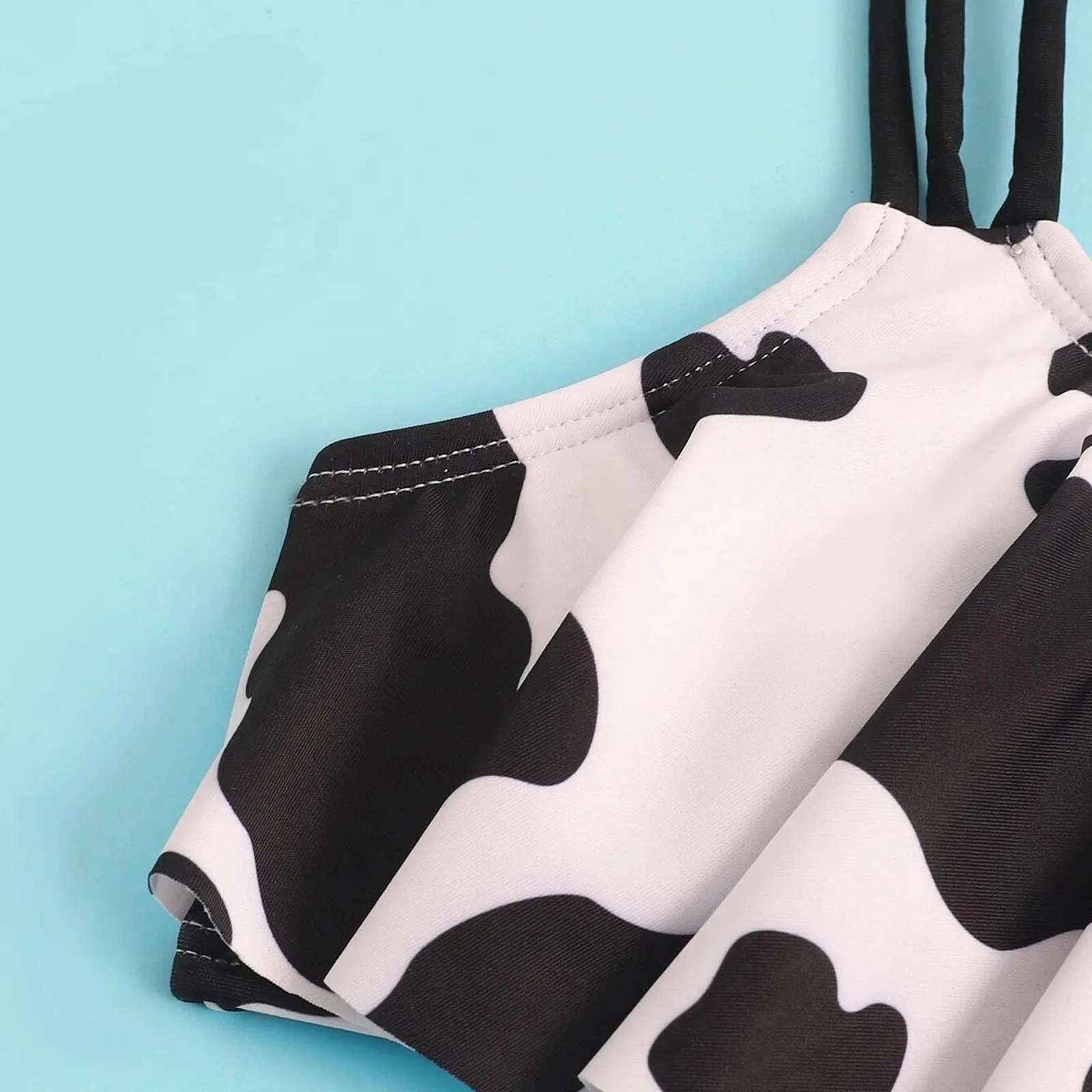Купальник с лямкой на шее и открытой спиной для девочек-подростков, купальник из двух предметов с коровьим цветочным принтом, летняя пляжная одежда для плавания