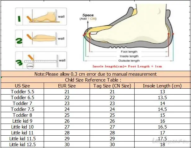 Поскольку все размеры детской обуви отличаются, при заказе детской обуви вы должны соответствовать нашим размерам и внутренней длине.