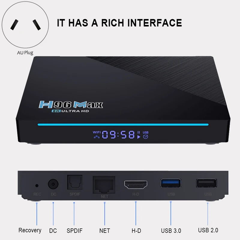 USB:1 Высокоскоростной USB 3,0 и 1 высокоскоростной USB 2,0Профиль VP9-2 до 8k x 4K x 2K @ 60fpsHDMI: HDMI 2,1, поддержка HDMI CEC, динамический HDR и HDCP 2,2, 4K x 2K @ 75 выход с максимальным разрешением.Кард-ридер: TF карты, поддержка 4 ГБ/8 ГБ/16 ГБ/32 ГБLAN: Ethernet: стандарт 10/1000 RJ-45AV: ПоддержкаПриложения: приложения бесплатно загружают android market, amazon app store и т. Д.Средний: воспроизведение локальных медиа, Поддержка HDD, U диск, tf-картаПоддержка функции DLNAПоддержка беспроводной мыши/клавиатуры 2,4GТехнические характеристики оборудованияНабор микросхем: четырехъядерный процессор RK3566 64 бит Cortex-A55ОС: Android 11,0Графический процессор: Mali-G52-2EEWiFi: 2,4G + 5GBT: 4,0Источник питания: 5 В/2 а постоянного токаИндикатор питания (светодиодный) Включение питания: синийТип штепсельной вилки: штепсельная вилка AU, она относится к Австралии и так далее/штепсельная вилка Великобритании, она относится к Малайзии, Великобритании и так далее. / Штепсельная Вилка европейского стандарта, это относится к Индонезии, Германии, Франции, Испании, Италии и так далее/штепсельной вилке США, это относится к Канаде, Индии, Мексике, Таиланду, США, Филиппинам, тайвань и так далее.Память: DDR3 8 ГБ/4 ГБВспышка: EMMC 64 Гб/32 ГБЦвет: черныйМатериал: АБС-пластикПосылка:1 x телеприставкаКабель HD-1 шт.1 x инфракрасный пульт дистанционного управления1 х адаптер питания1 х руководство на английском языкеТолько вышеуказанная посылка, другие товары не включены.Примечание: светильник и различные дисплеи могут привести к тому, что цвет товара на картинке немного отличается от реального. Допускается погрешность в измерениях +/- 1-3 см.