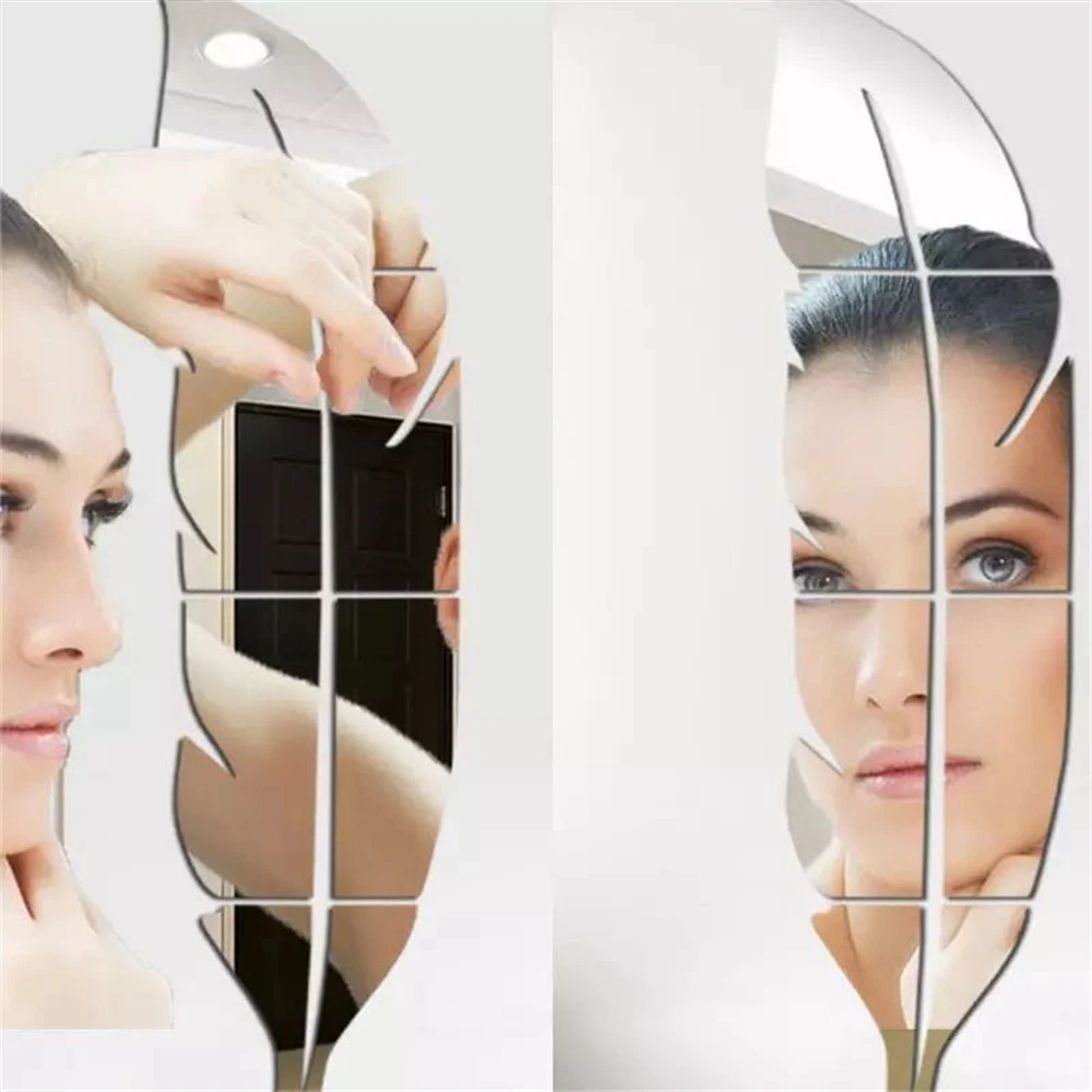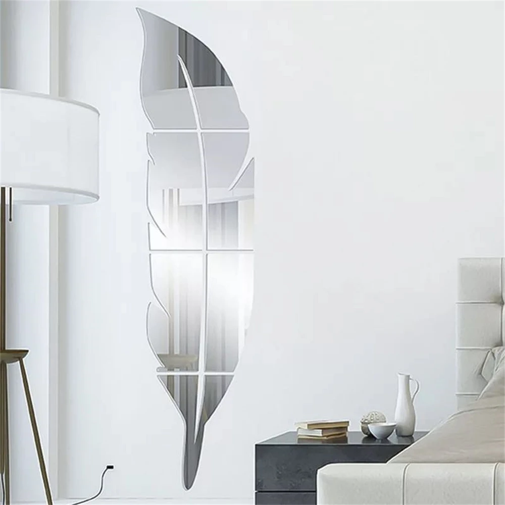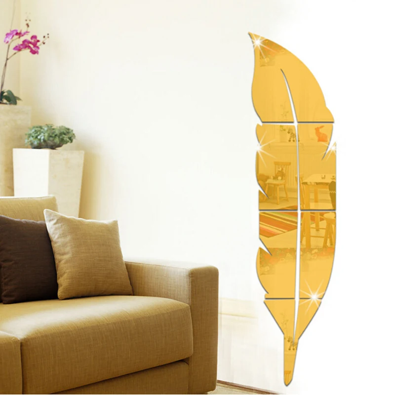 DIY перо 3D акриловые зеркальные Наклейки для декора стен модные самоклеющиеся настенные наклейки для гостиной зеркальные, серебряные, золотистые