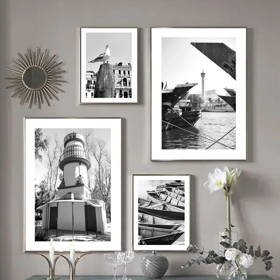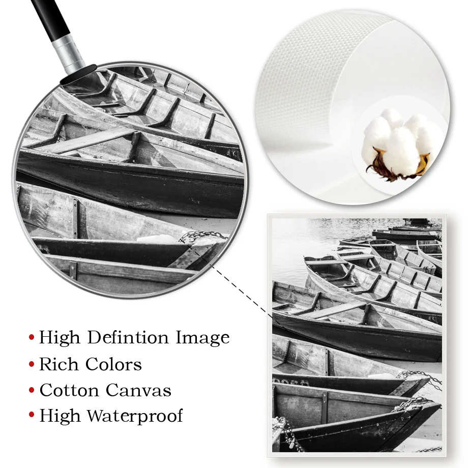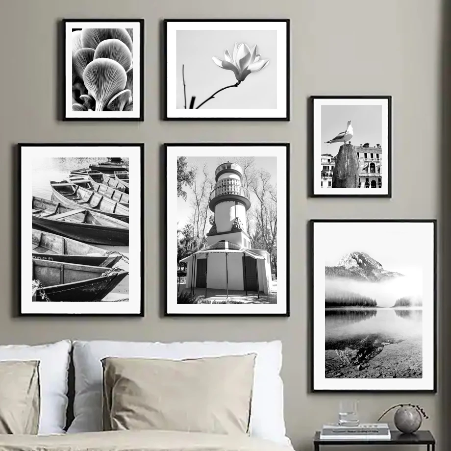 Настенные картины на холсте с изображением пляжа, грибов, лодки, птиц, цветов, черного и белого цветов, скандинавские плакаты и принты, настенные картины, декор для гостиной